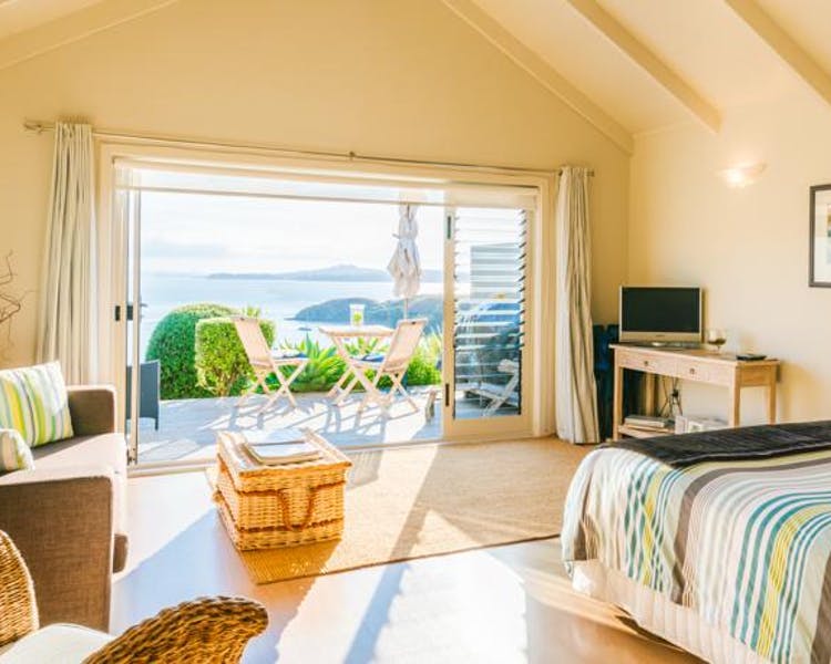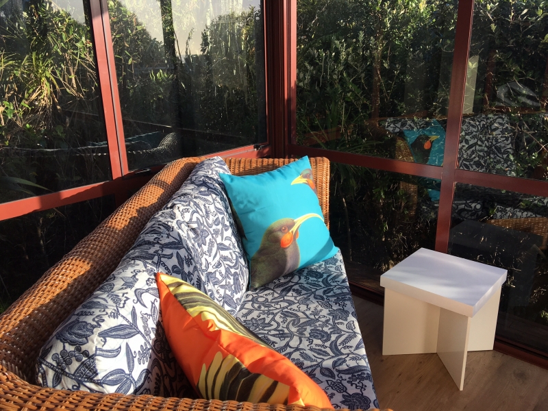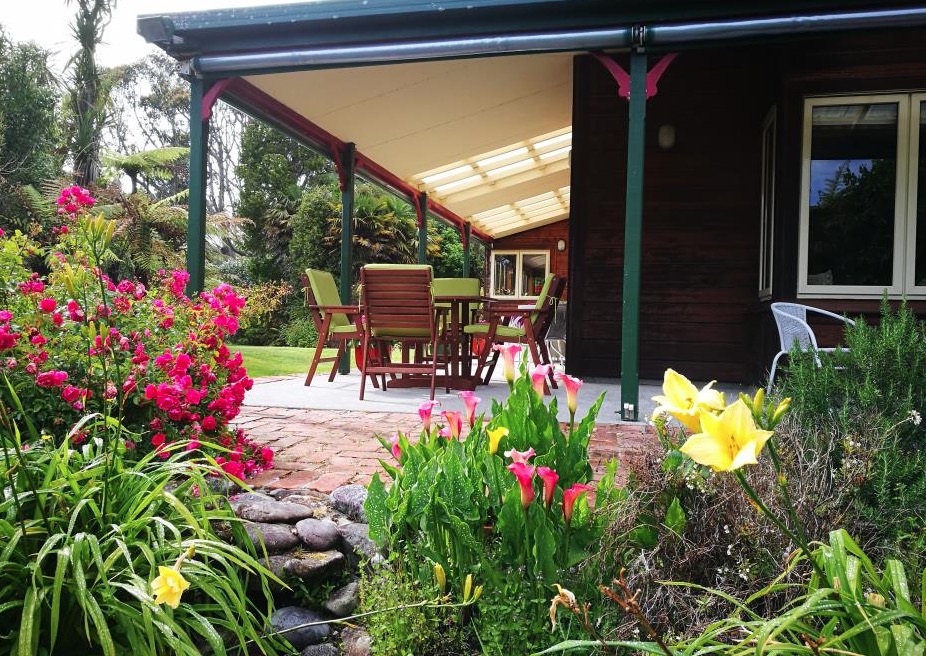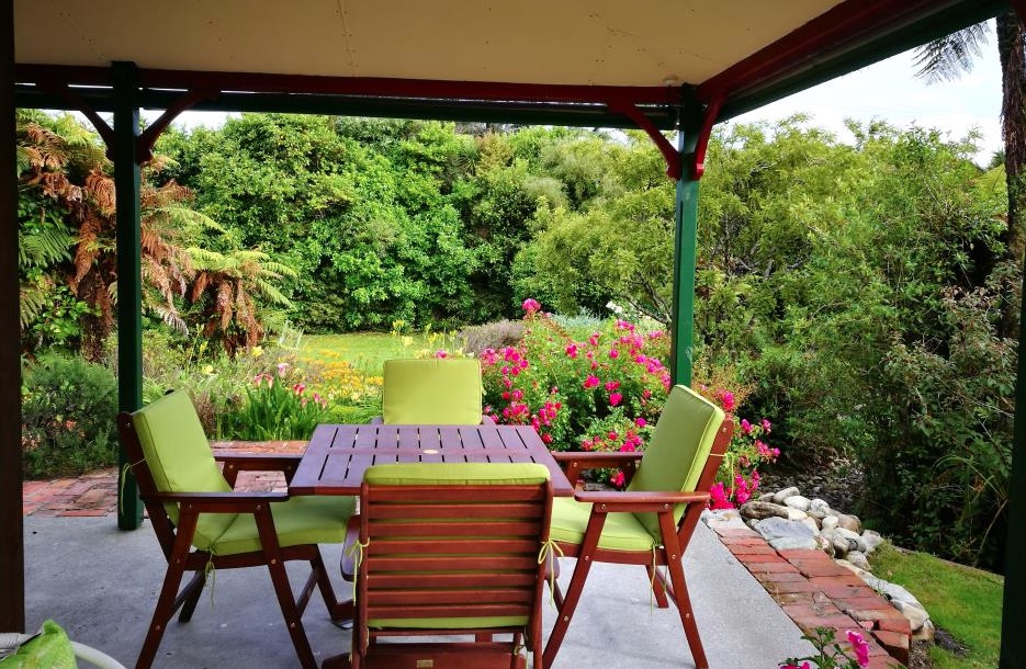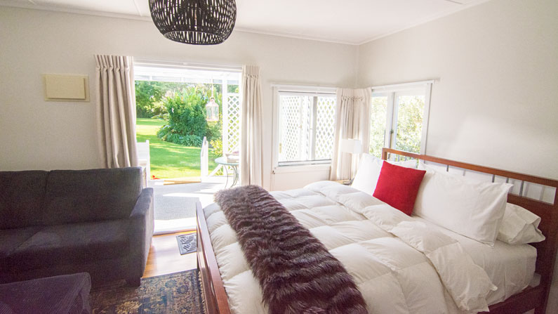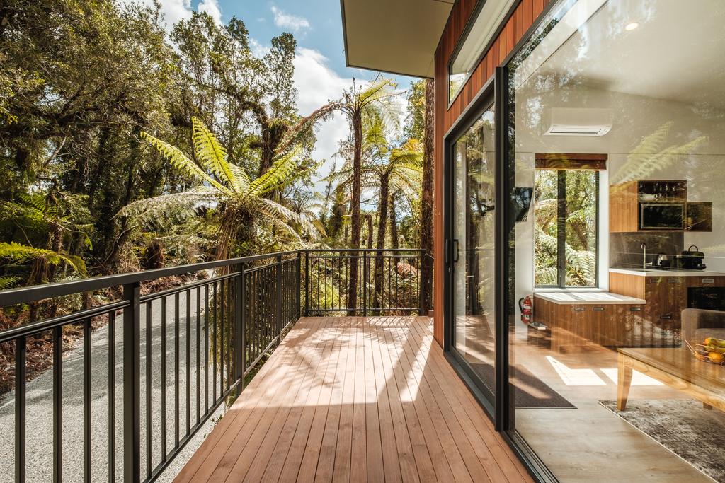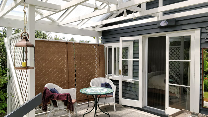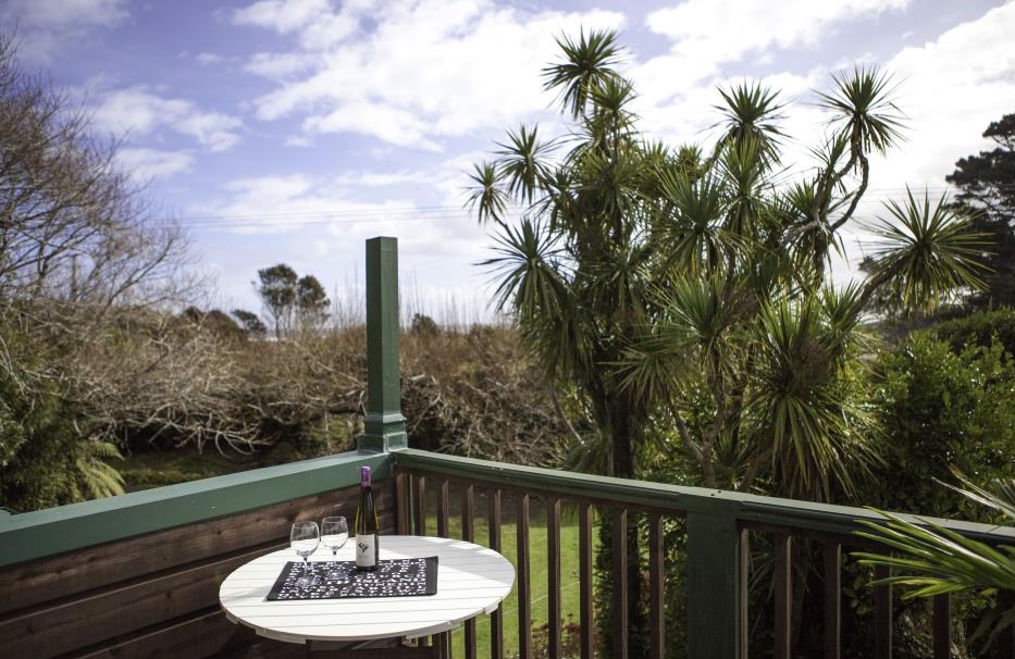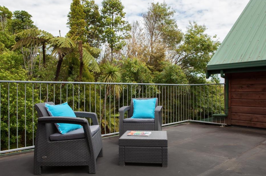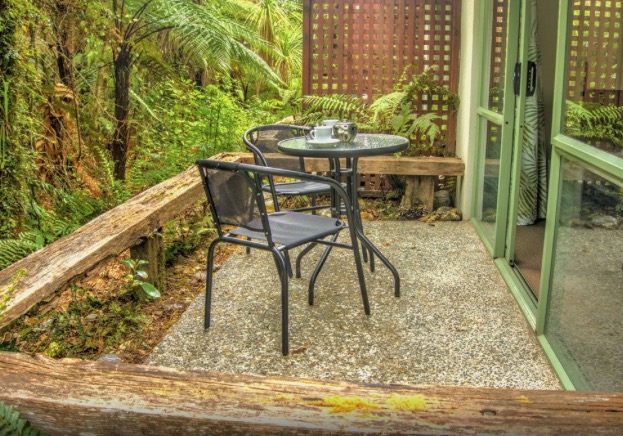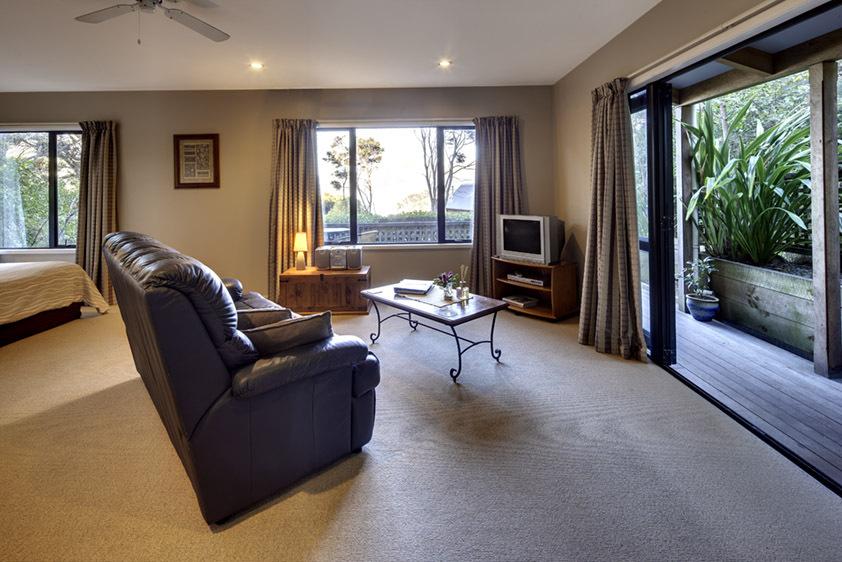 Draußen hast du deinen eigenen privaten Sitzbereich und kannst dort einen tollen Blick auf neuseeländisches Buschland genießen. Hier hörst du nur die Vögel singen.