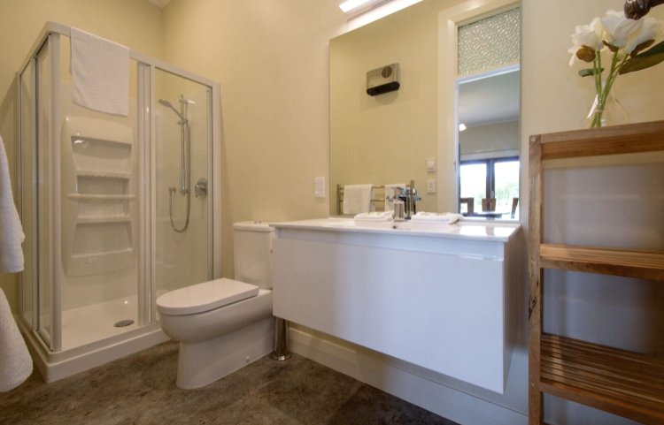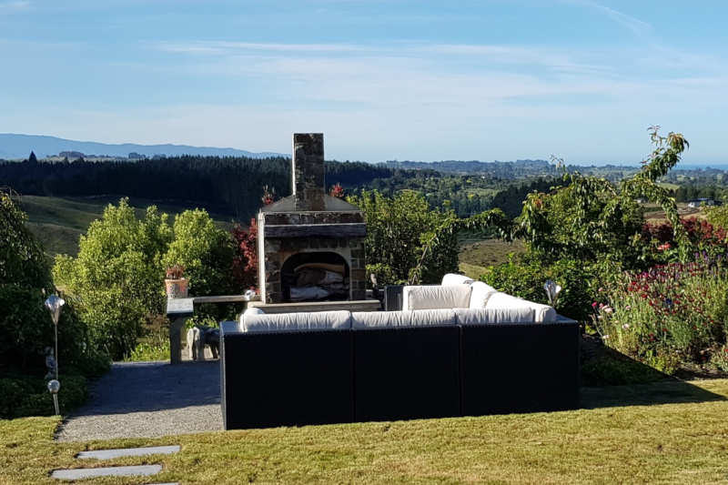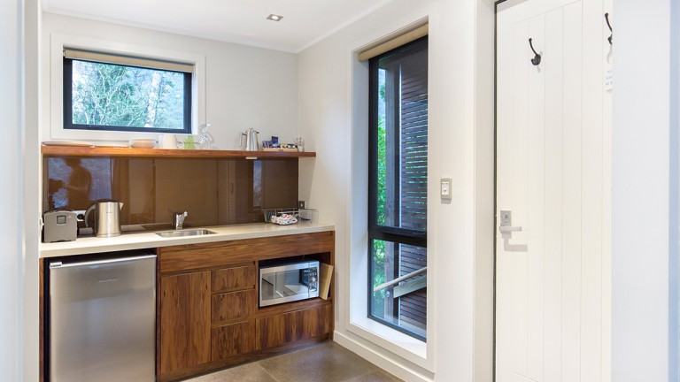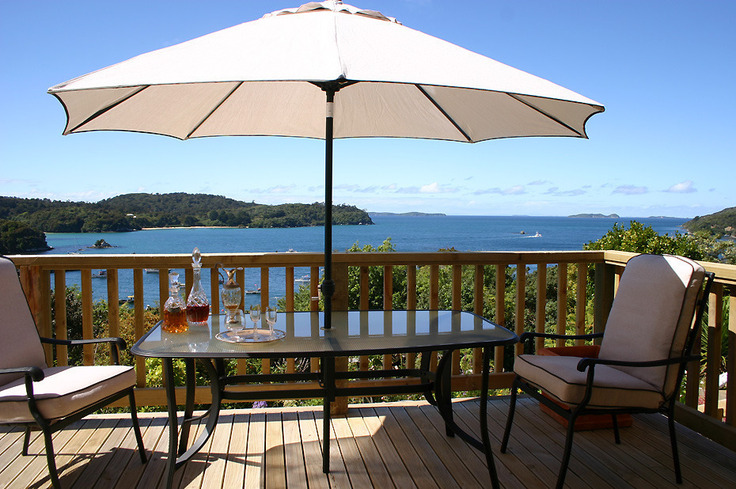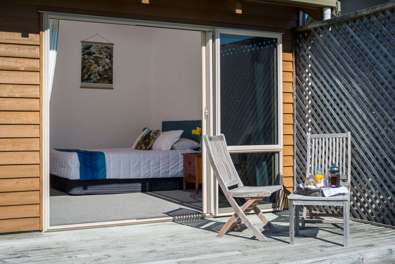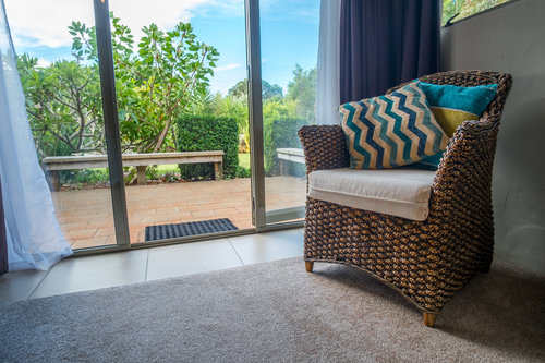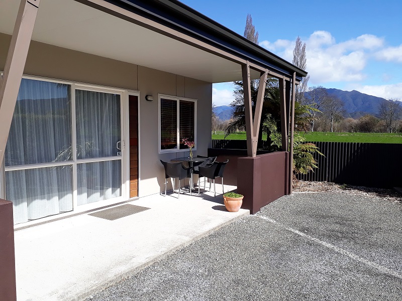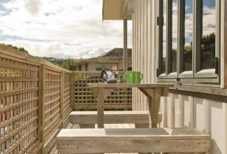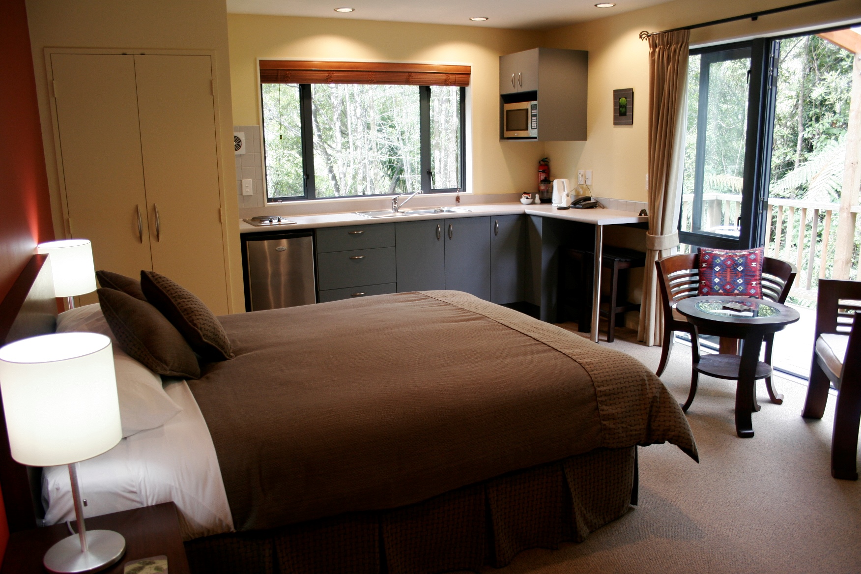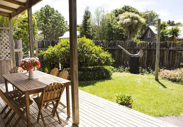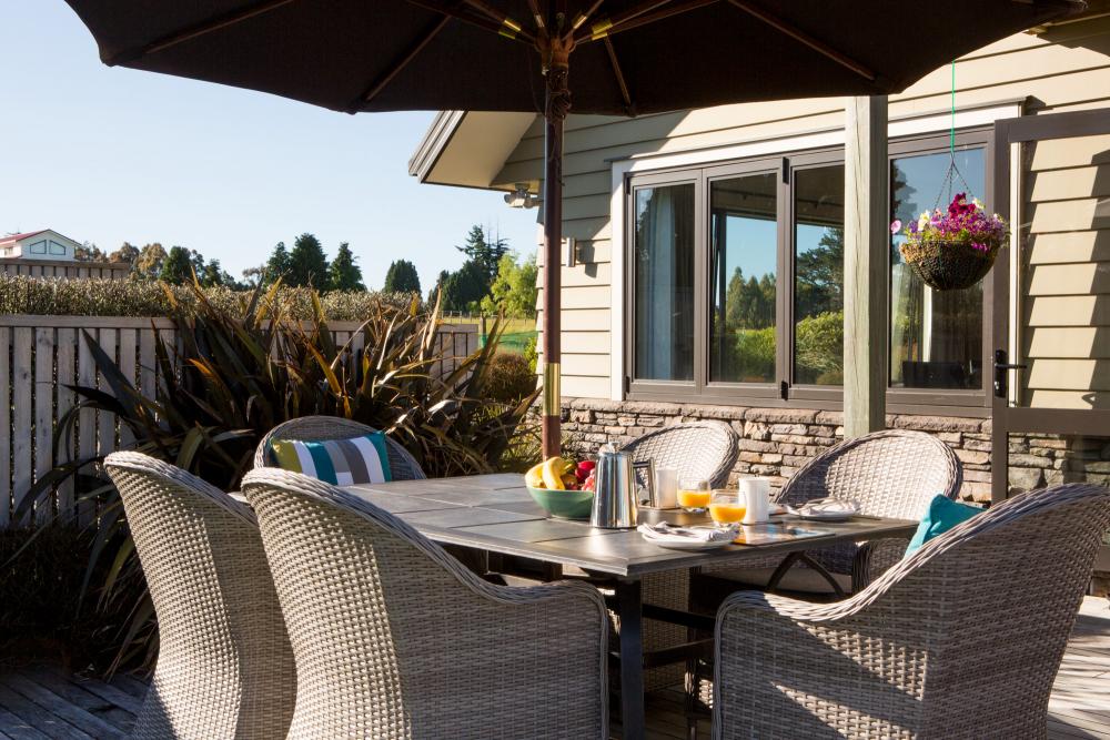 Draußen hast du deinen eigenen privaten Sitzbereich und kannst dort einen tollen Blick auf neuseeländisches Buschland genießen. Hier hörst du nur die Vögel singen.
