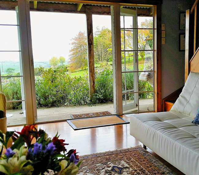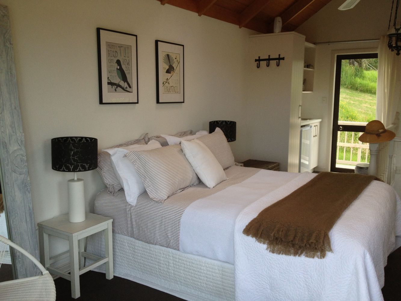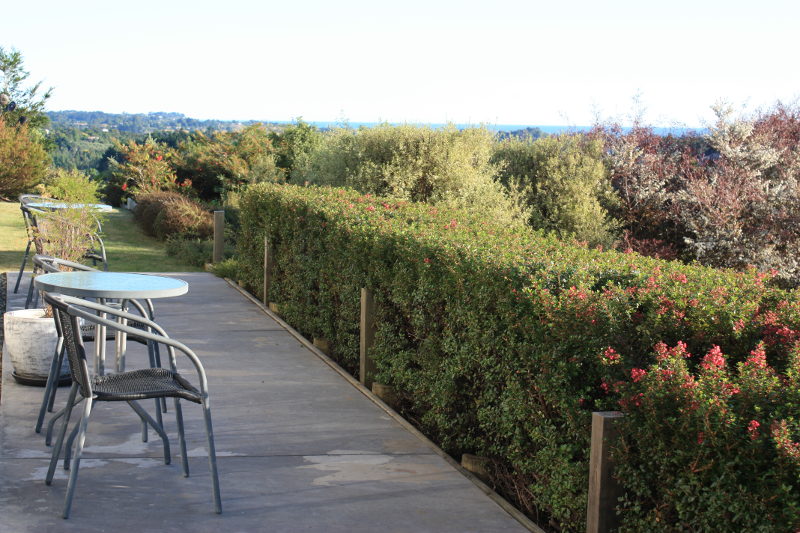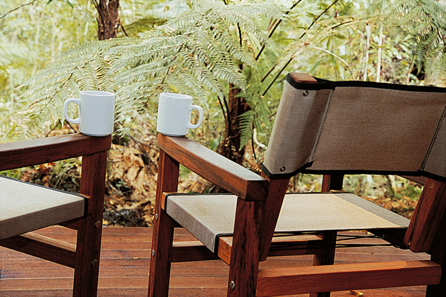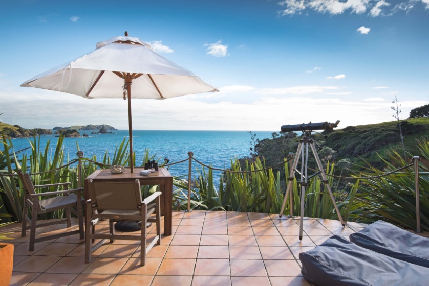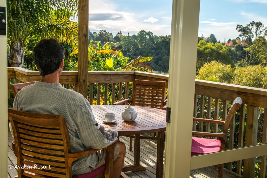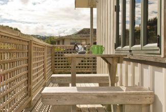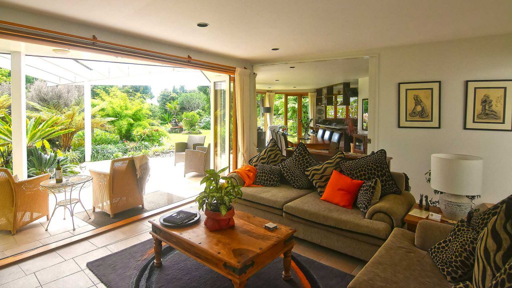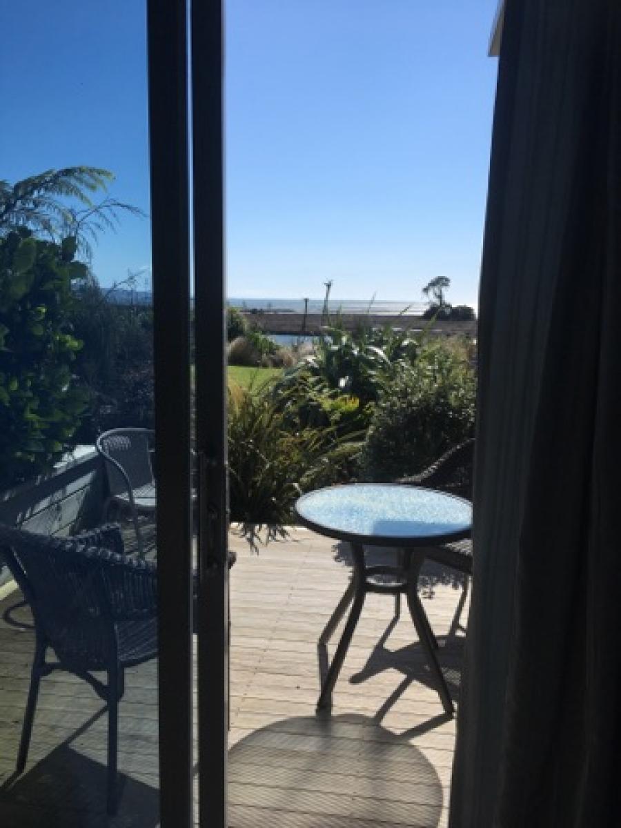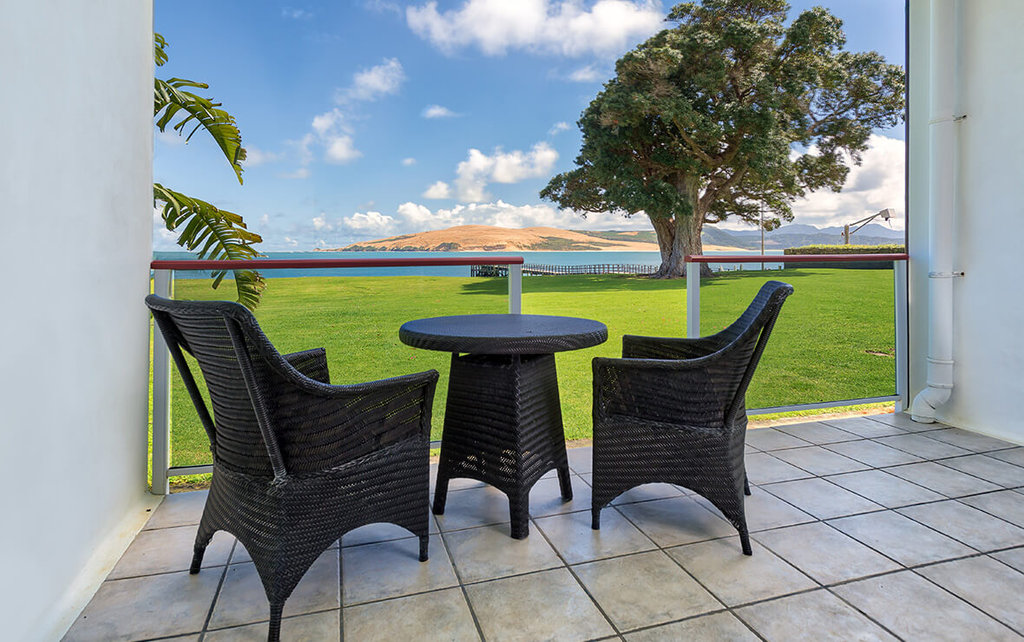 Draußen hast du deinen eigenen privaten Sitzbereich und kannst dort einen tollen Blick auf neuseeländisches Buschland genießen. Hier hörst du nur die Vögel singen.