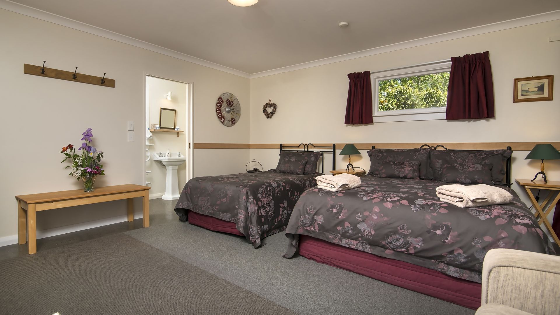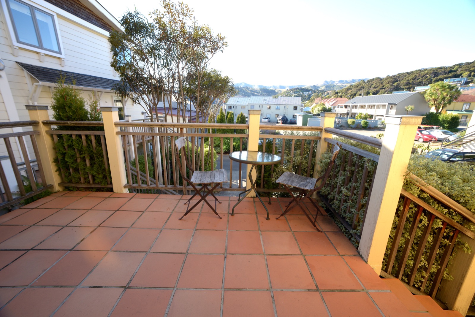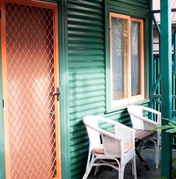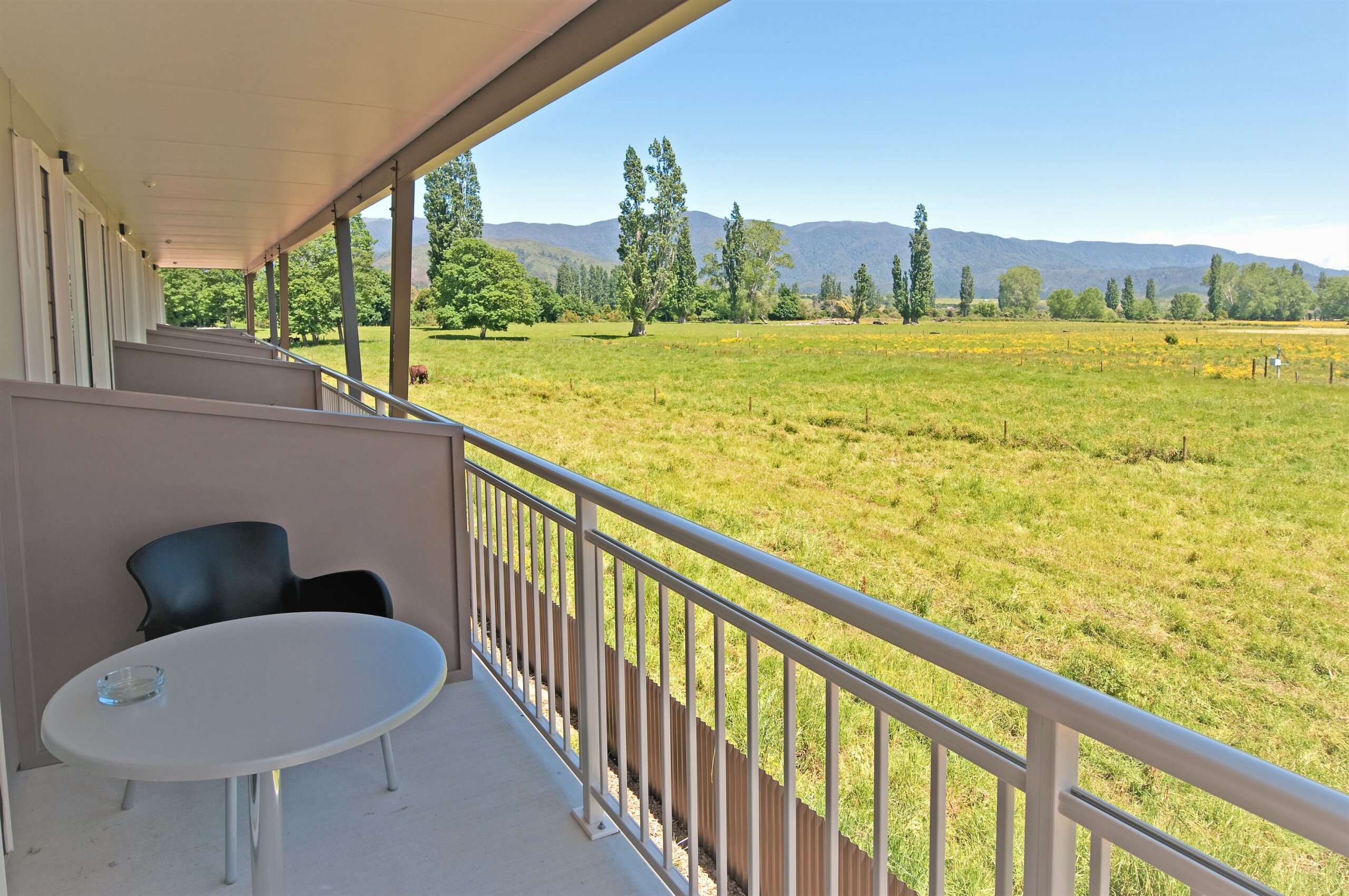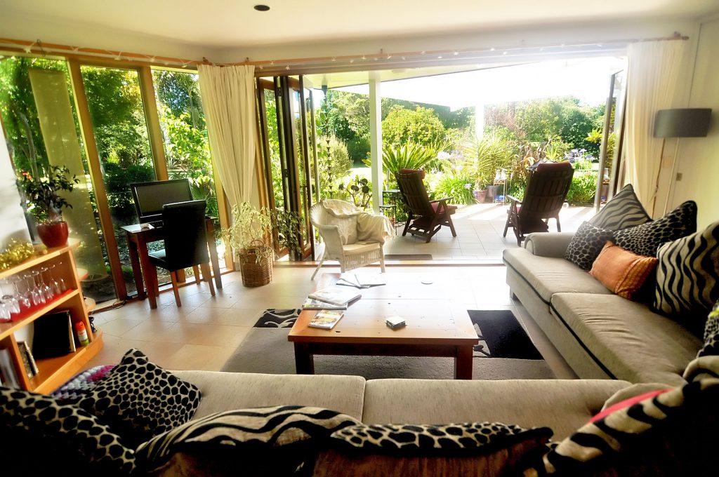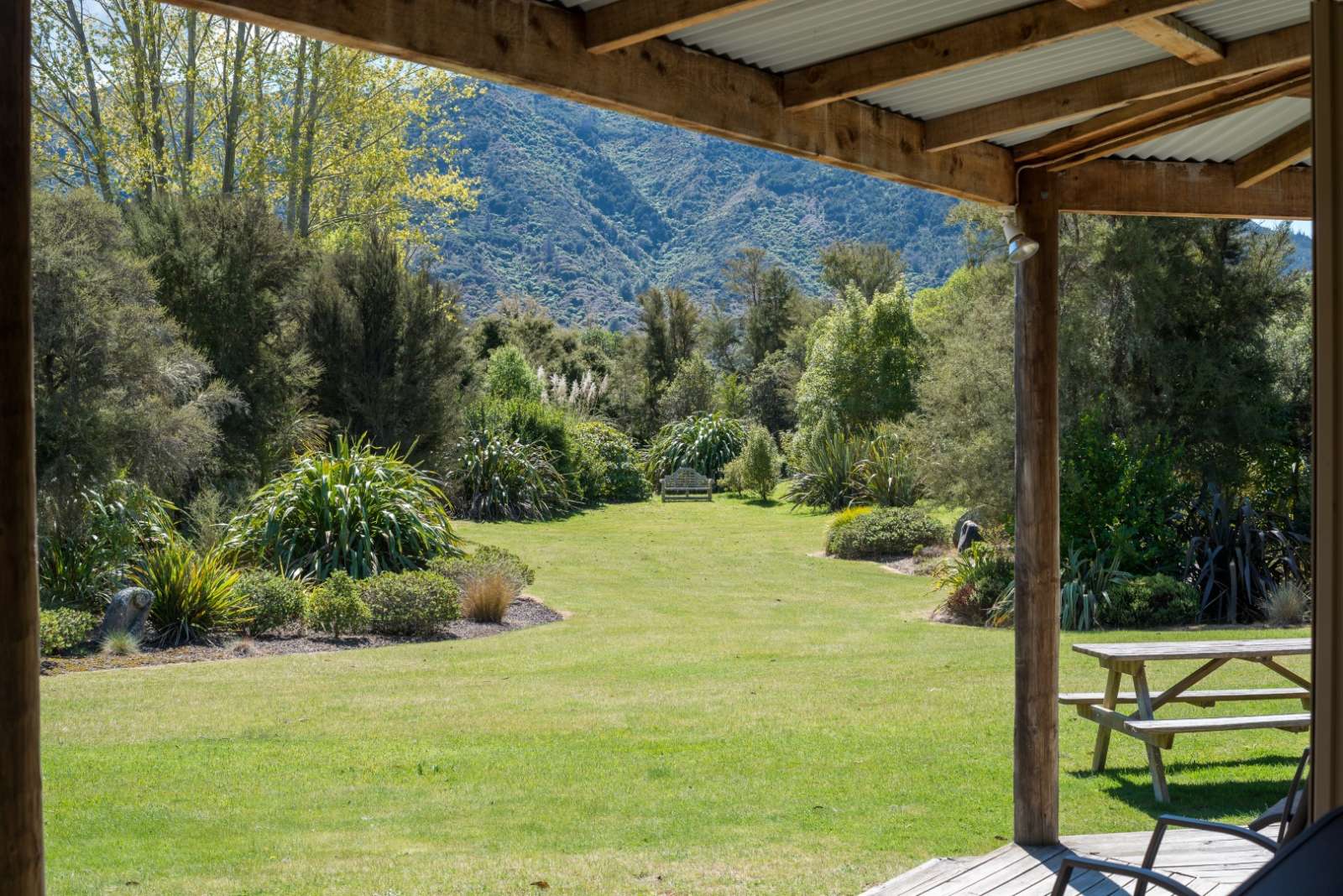 Draußen hast du deinen eigenen privaten Sitzbereich und kannst dort einen tollen Blick auf neuseeländisches Buschland genießen. Hier hörst du nur die Vögel singen.