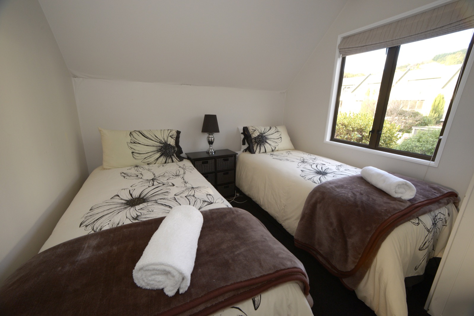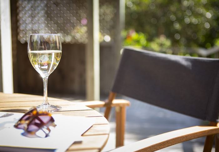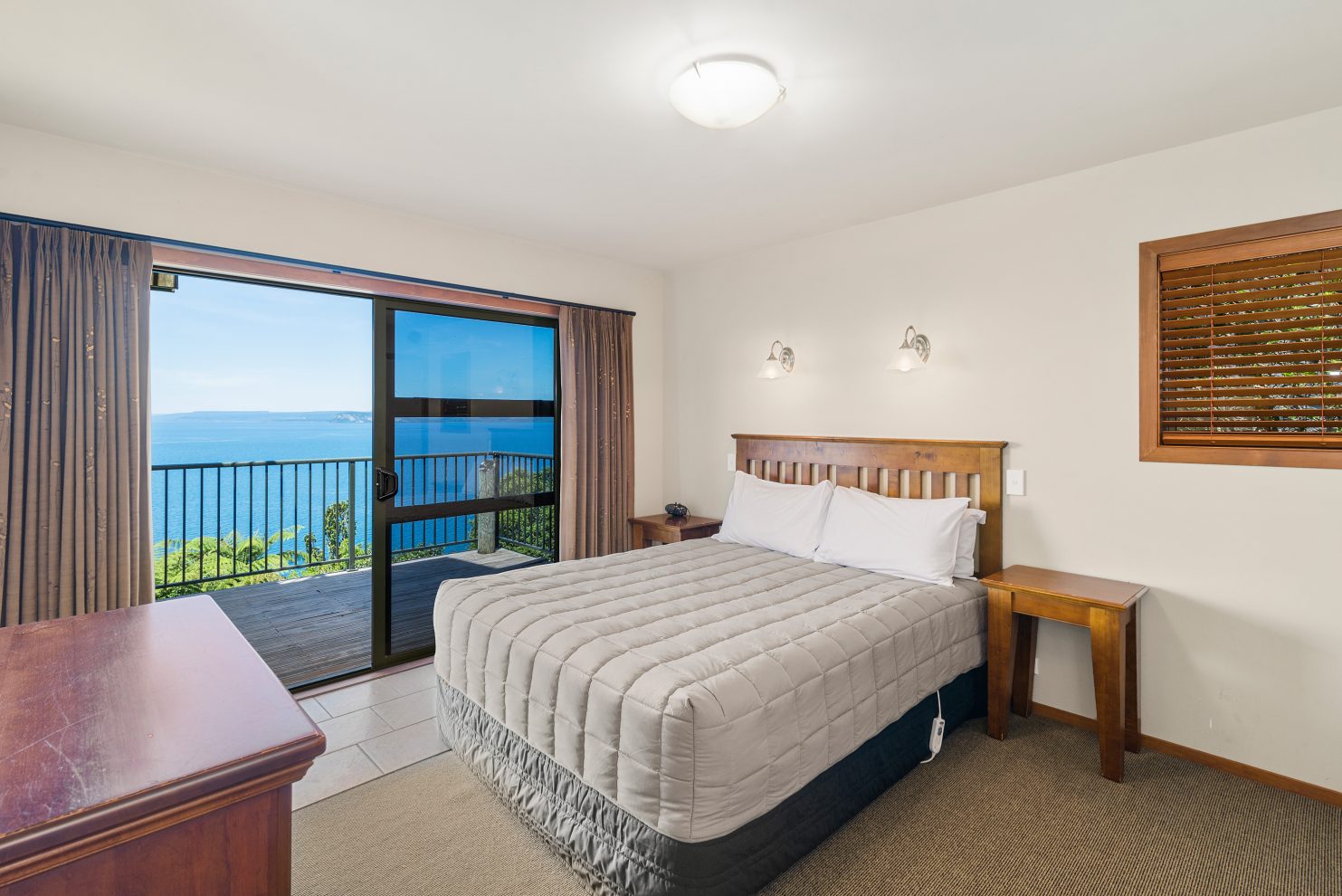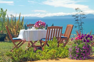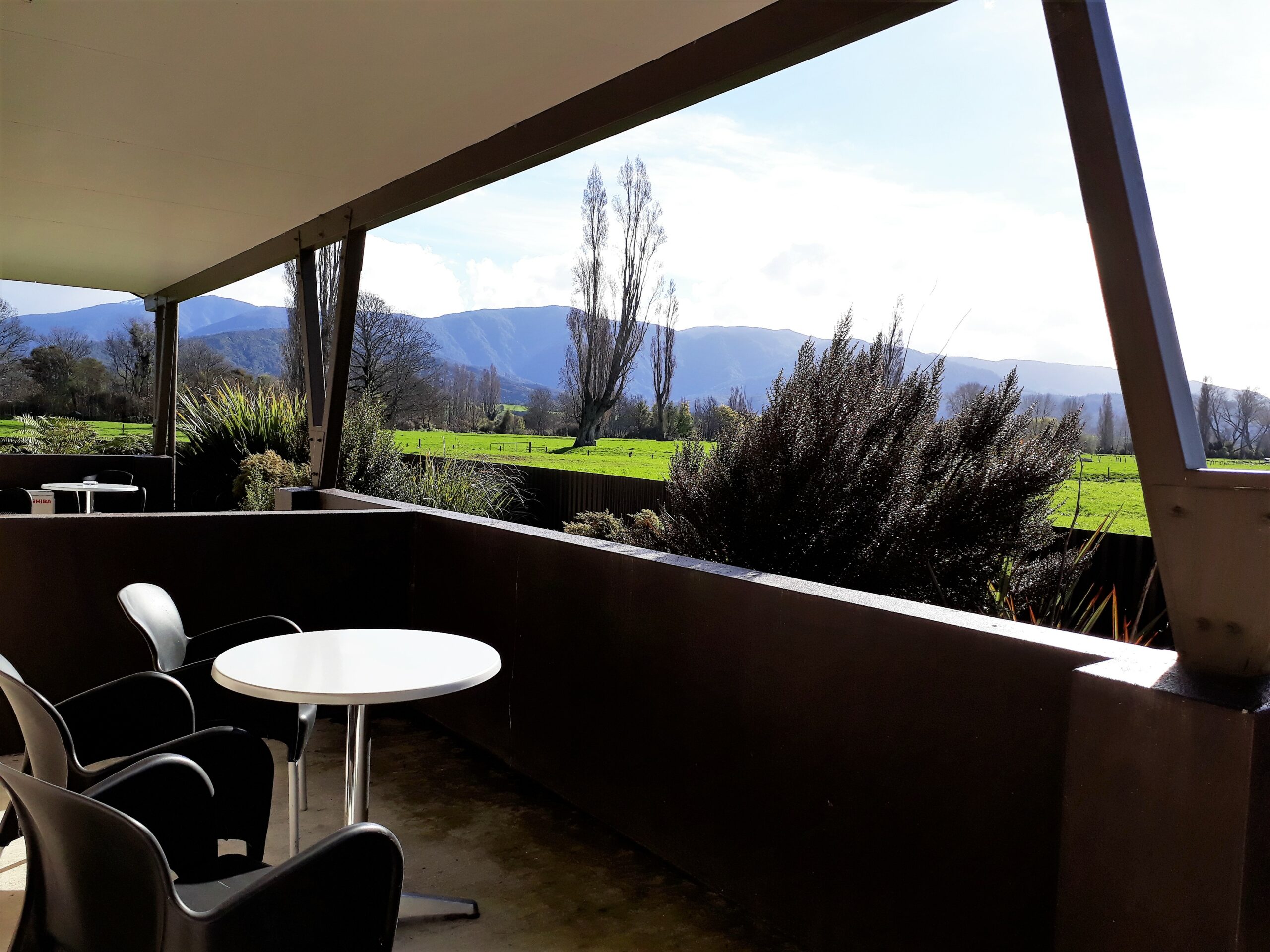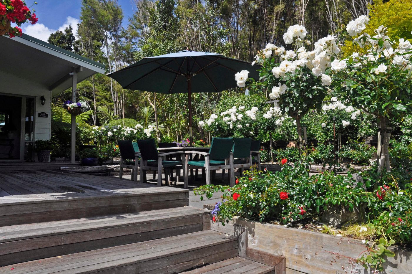 Draußen hast du deinen eigenen privaten Sitzbereich und kannst dort einen tollen Blick auf neuseeländisches Buschland genießen. Hier hörst du nur die Vögel singen.