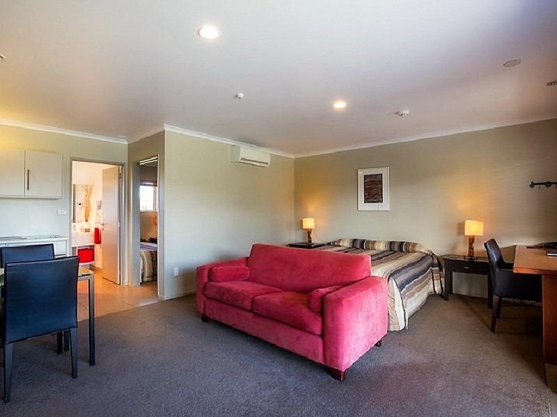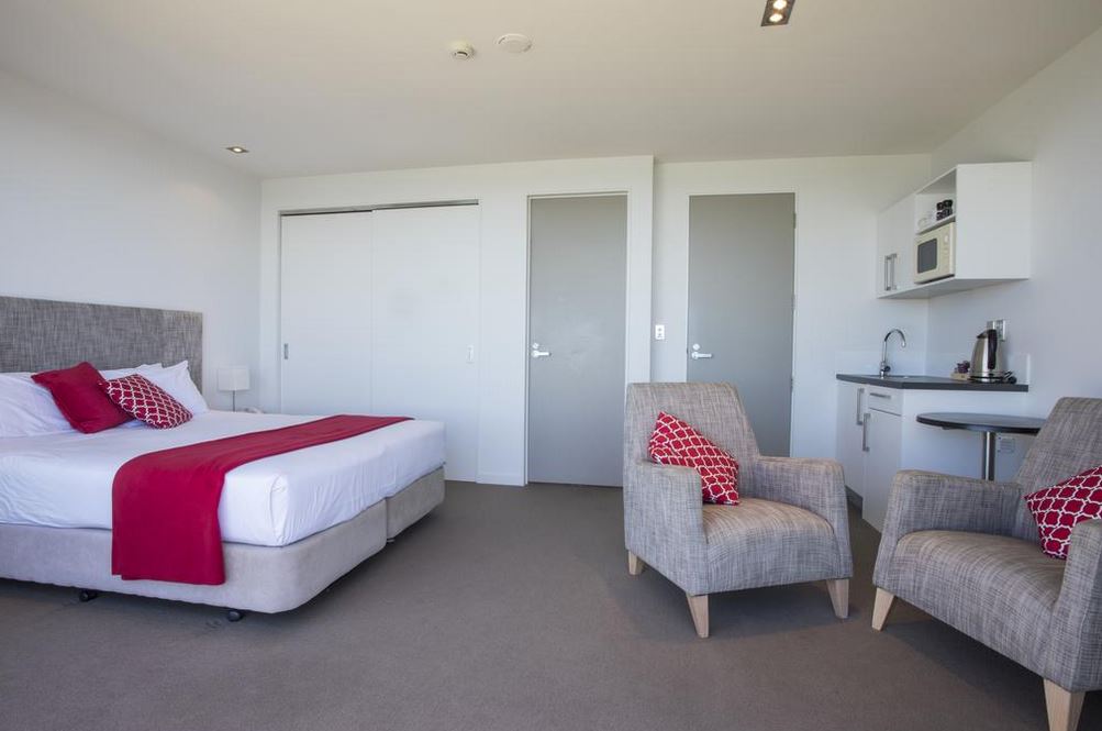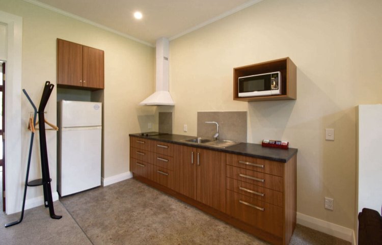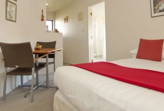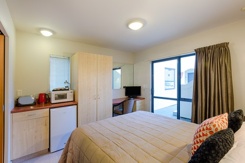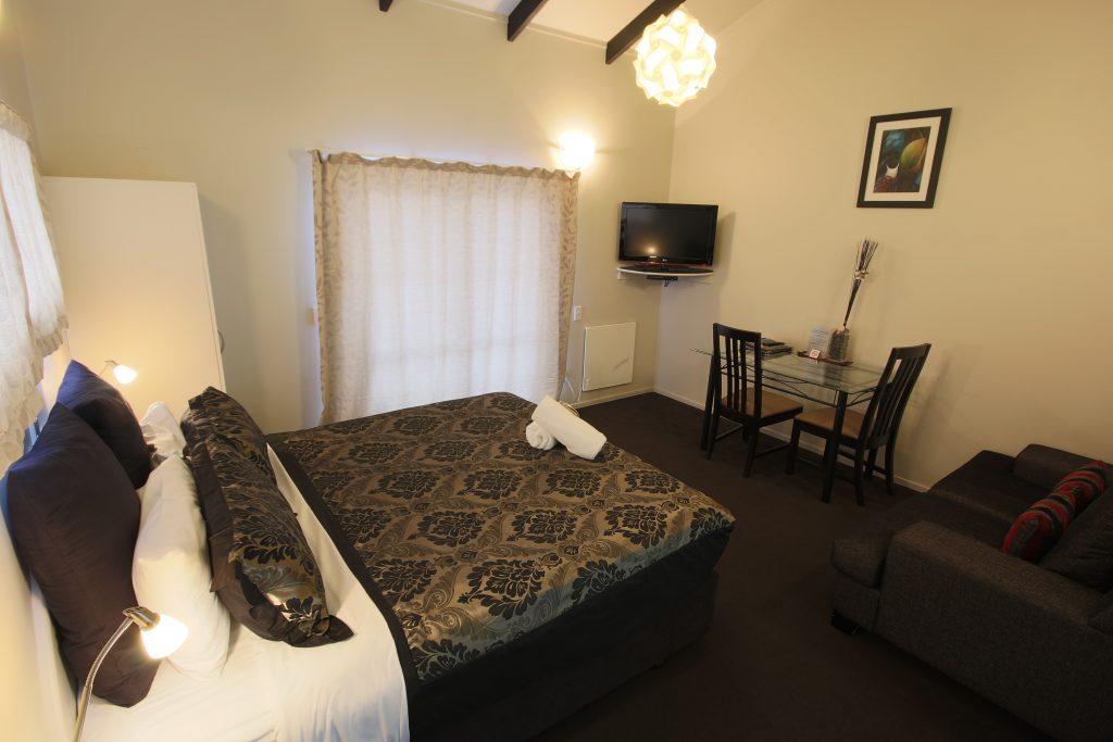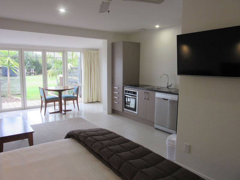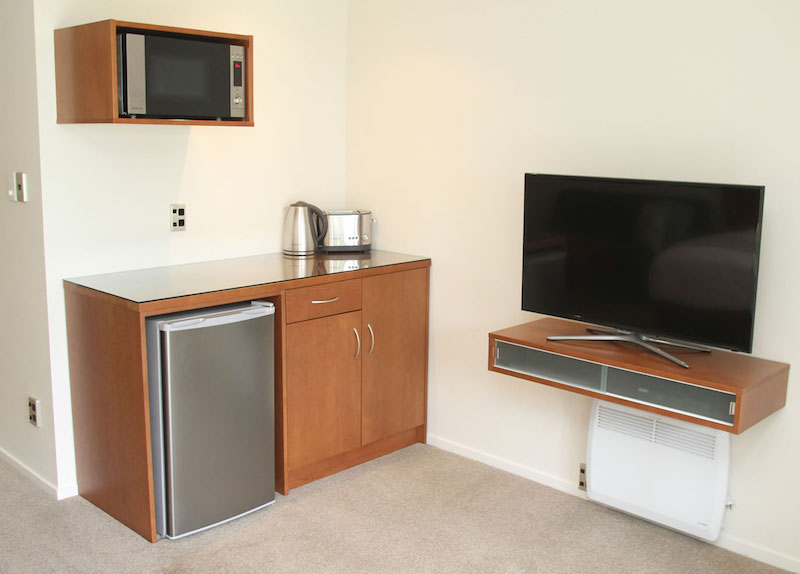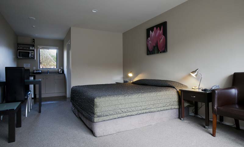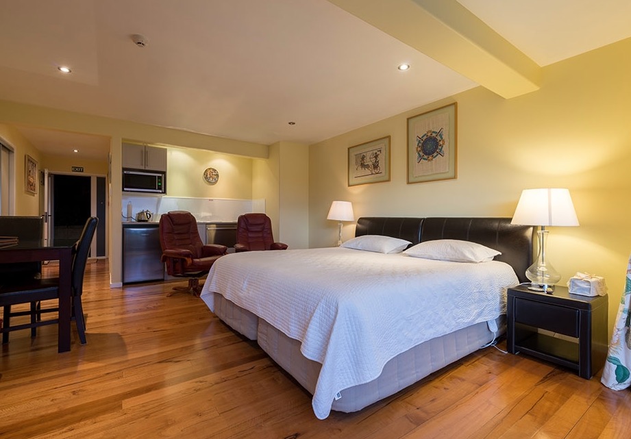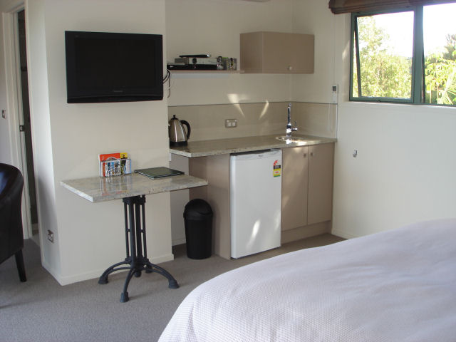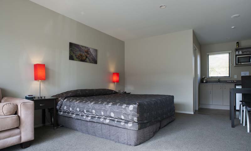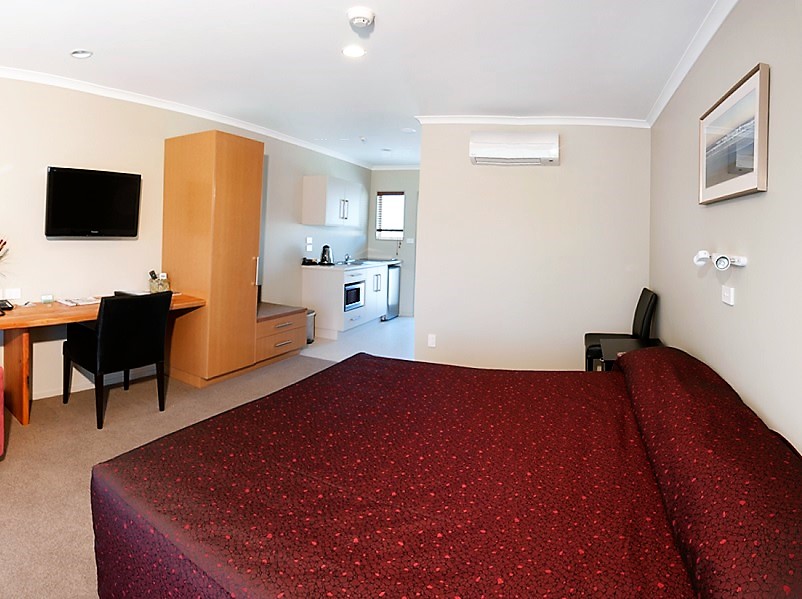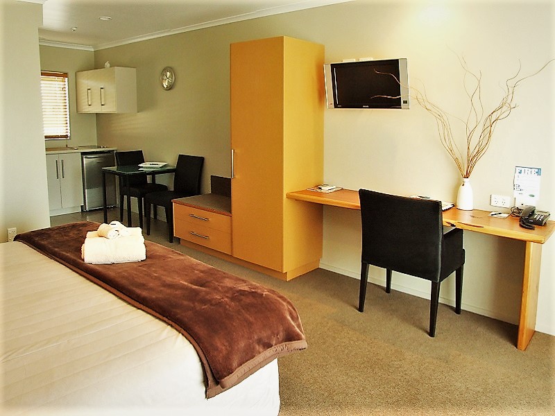Das Studio (25 qm) verfügt über eine voll ausgestattete Küchenzeile mit einer Mikrowelle, einem Kühlschrank und einem Wasserkocher. Es umfasst auch einen Schreibtisch, einen geräumigen Kleiderschrank und einen Safe im Zimmer. Klimaanlage, ein großes Bad und ein Flachbild-TV mit neuseeländischen Sat-Kanälen stehen zur Verfügung.