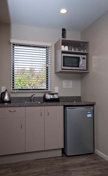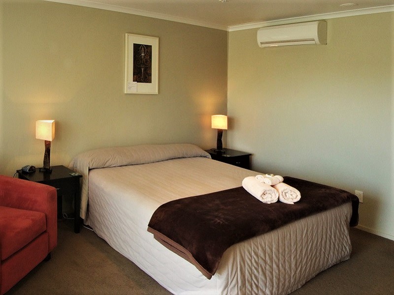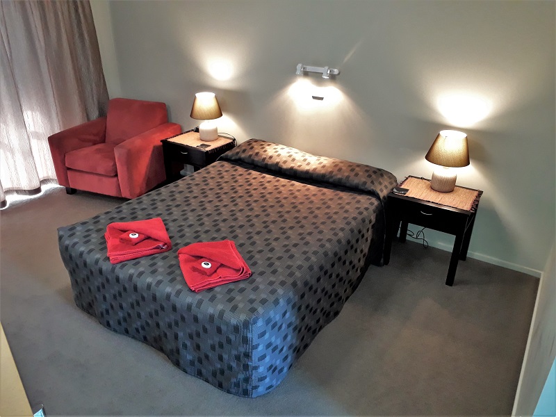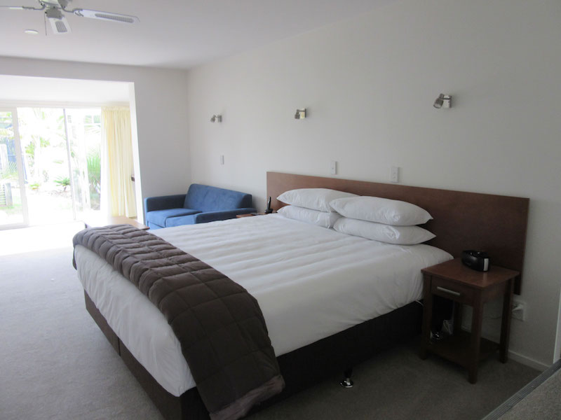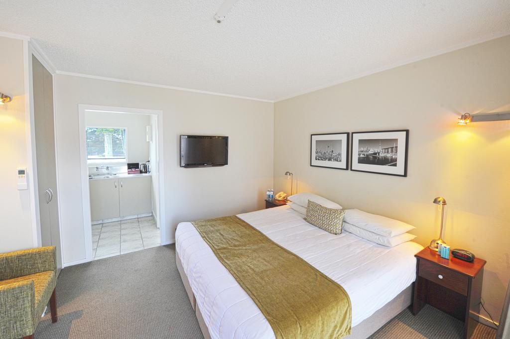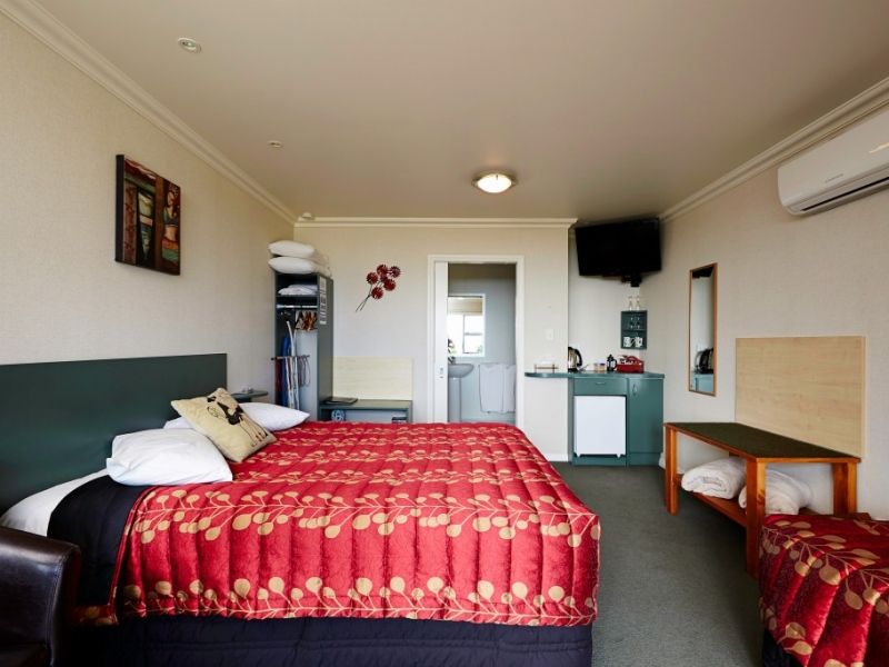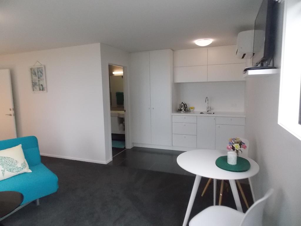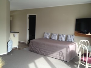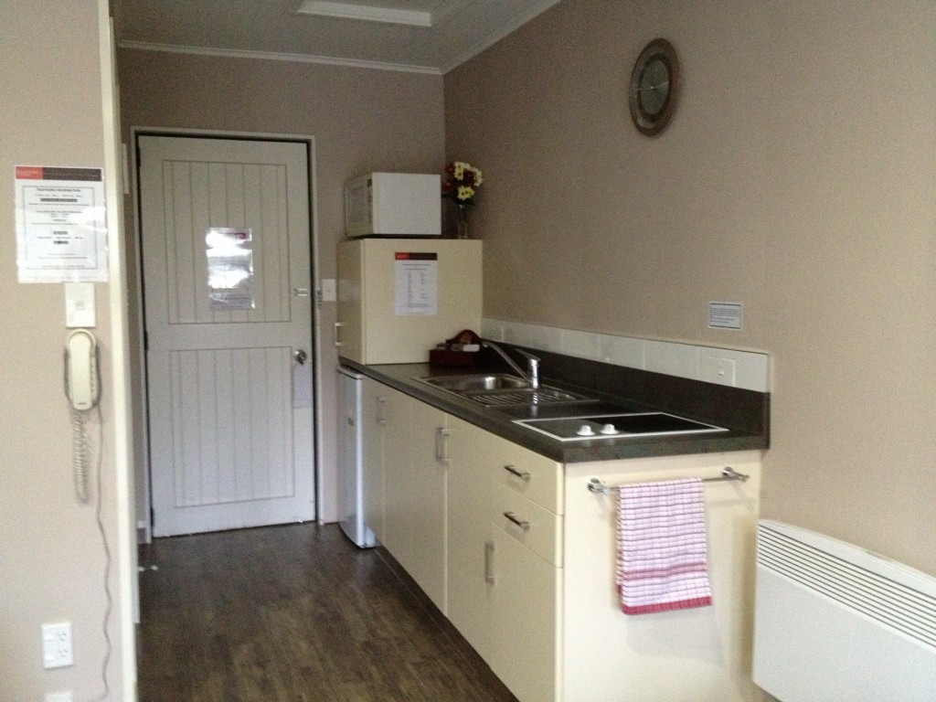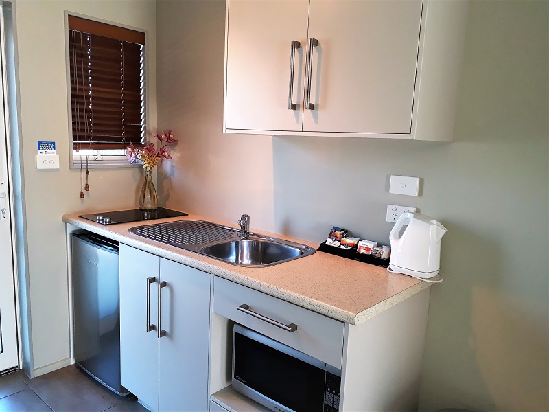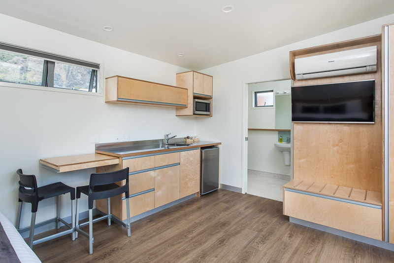 Das Studio (25 qm) verfügt über eine voll ausgestattete Küchenzeile mit einer Mikrowelle, einem Kühlschrank und einem Wasserkocher. Es umfasst auch einen Schreibtisch, einen geräumigen Kleiderschrank und einen Safe im Zimmer. Klimaanlage, ein großes Bad und ein Flachbild-TV mit neuseeländischen Sat-Kanälen stehen zur Verfügung.