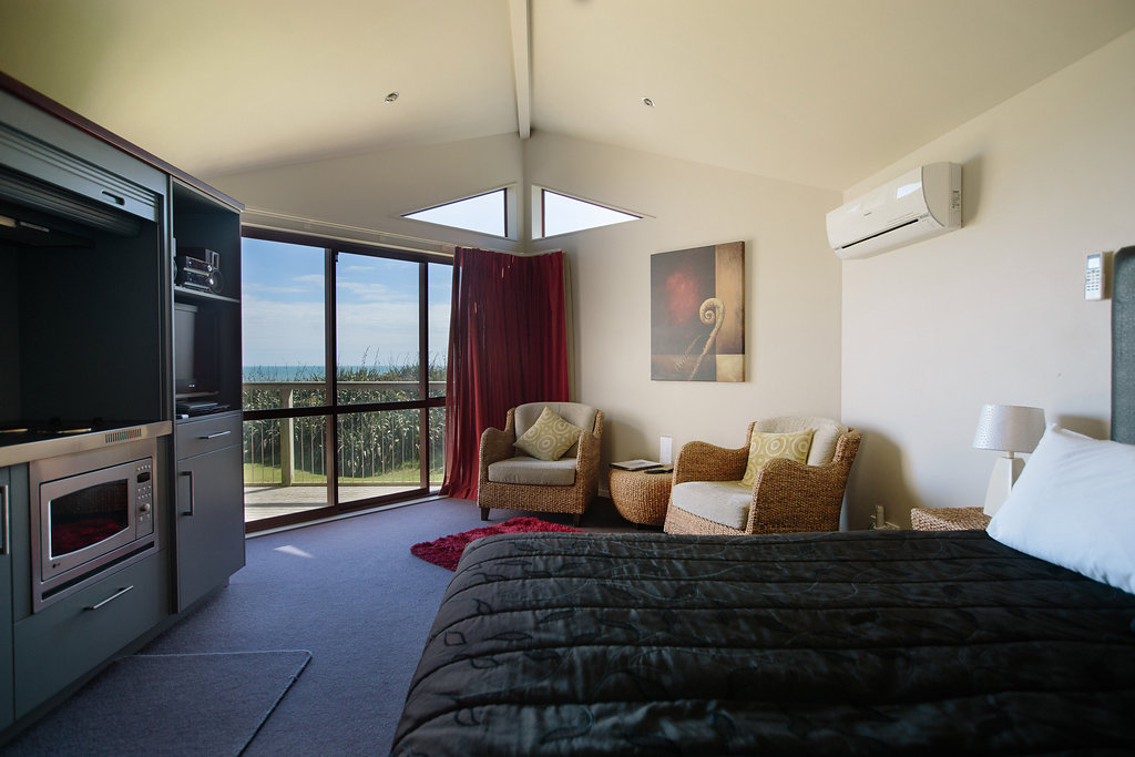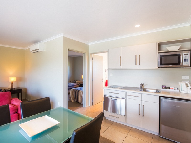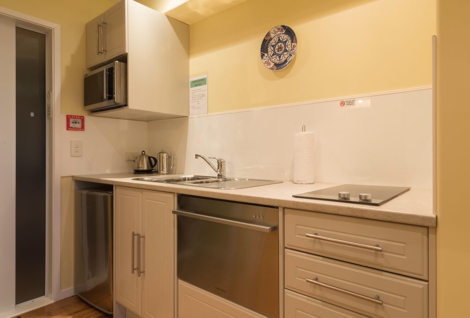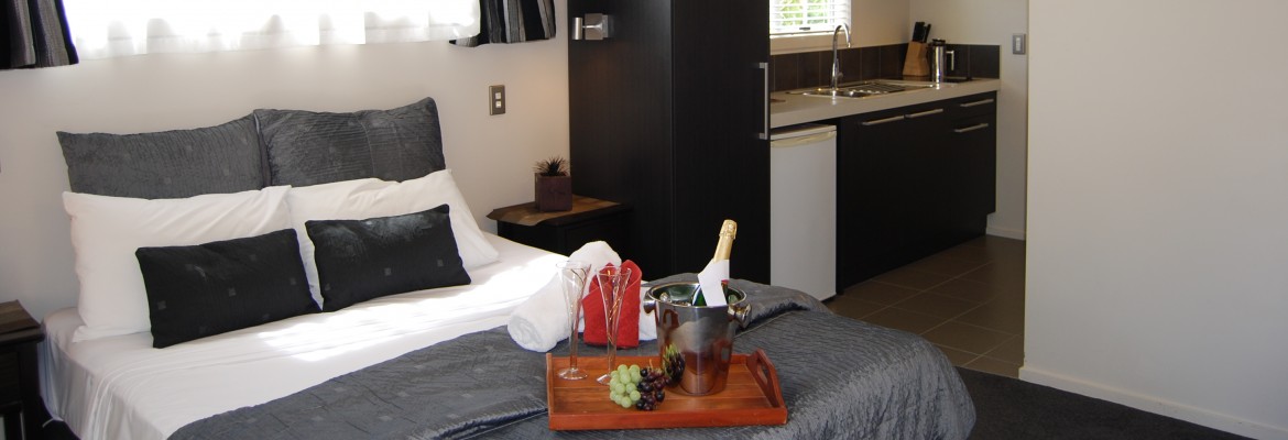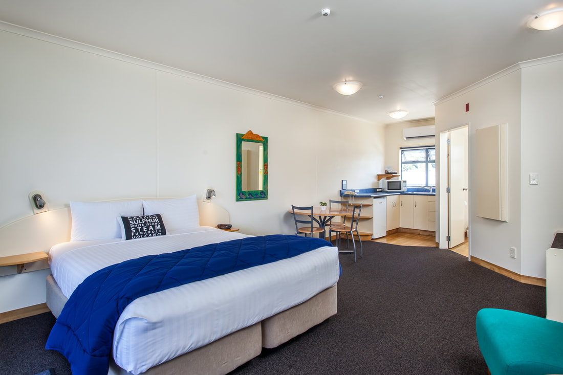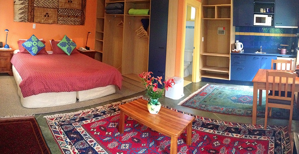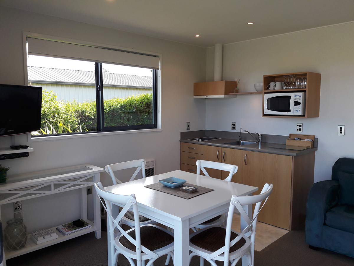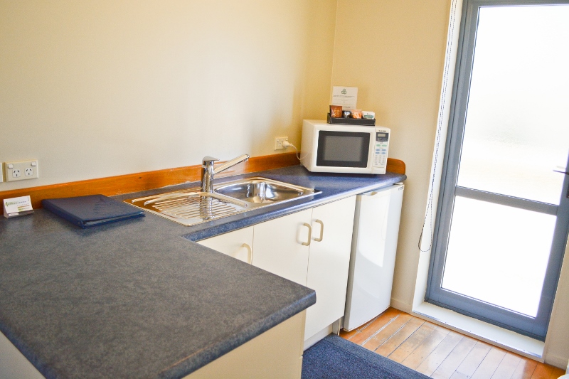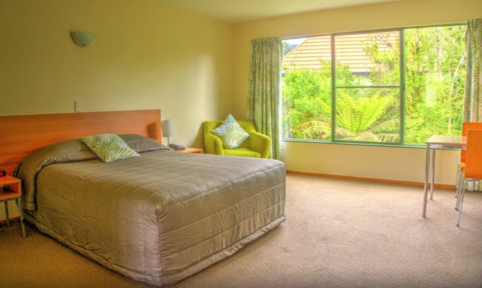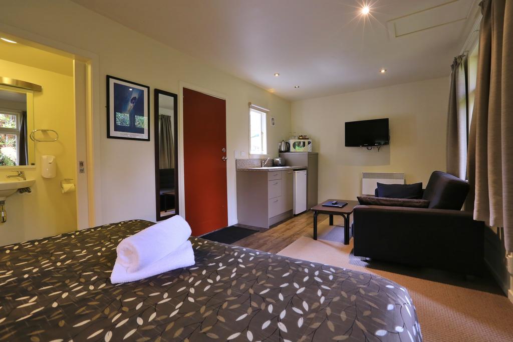 Das Studio (25 qm) verfügt über eine voll ausgestattete Küchenzeile mit einer Mikrowelle, einem Kühlschrank und einem Wasserkocher. Es umfasst auch einen Schreibtisch, einen geräumigen Kleiderschrank und einen Safe im Zimmer. Klimaanlage, ein großes Bad und ein Flachbild-TV mit neuseeländischen Sat-Kanälen stehen zur Verfügung.