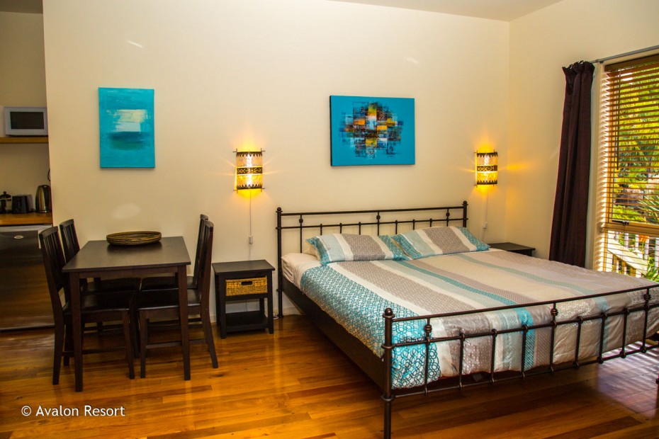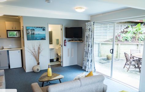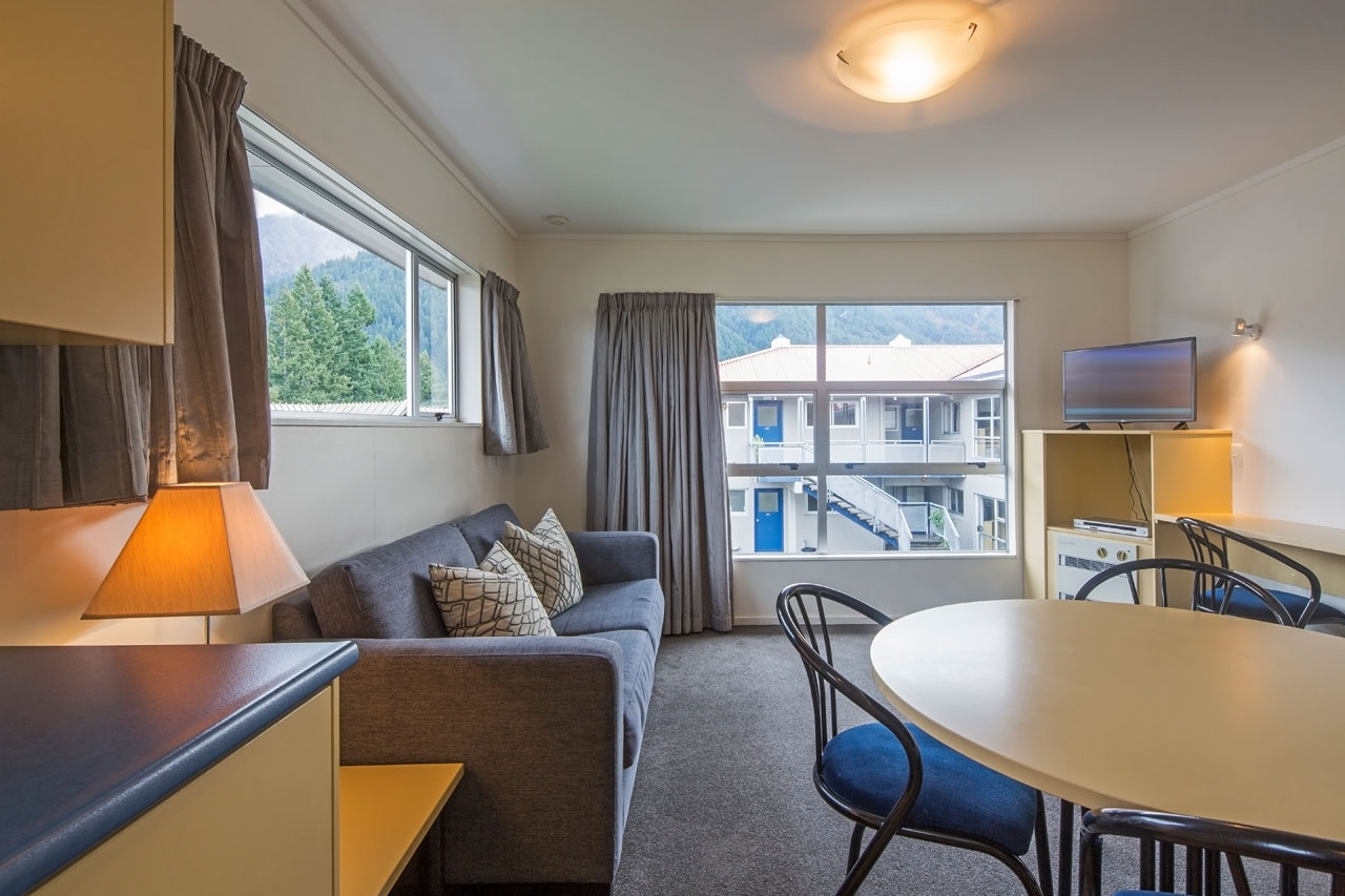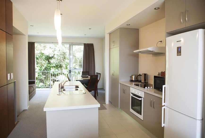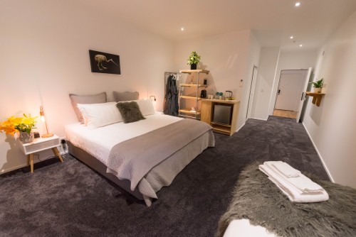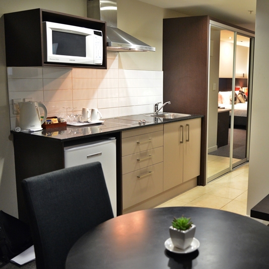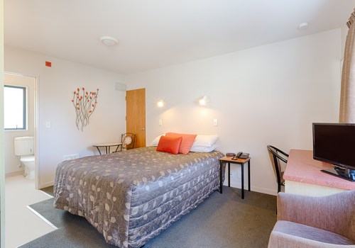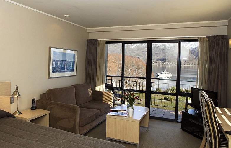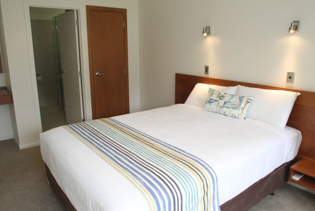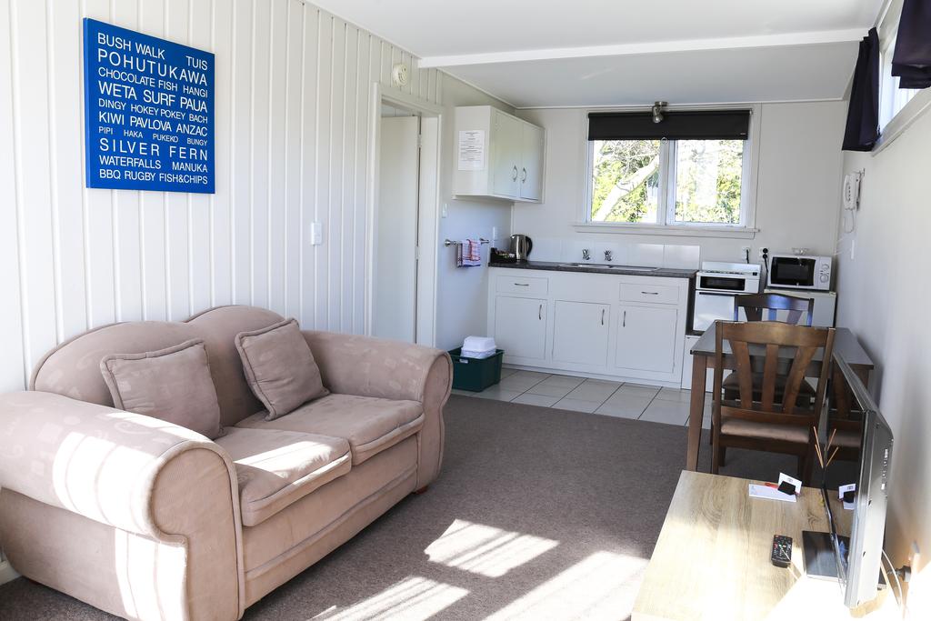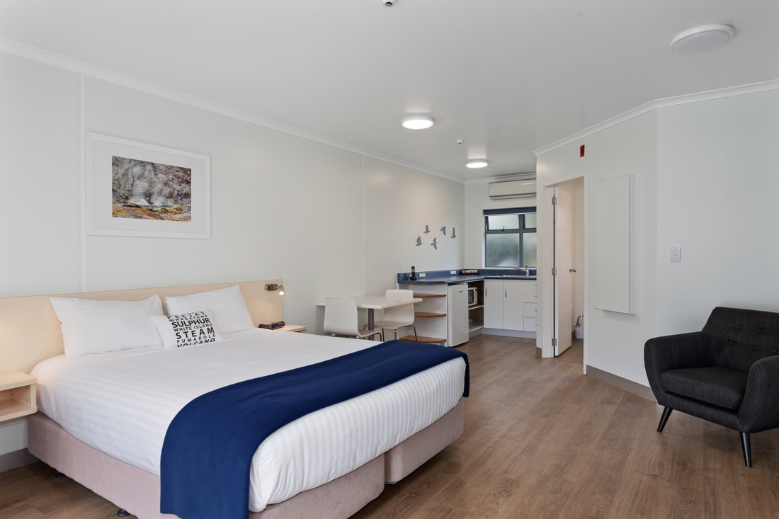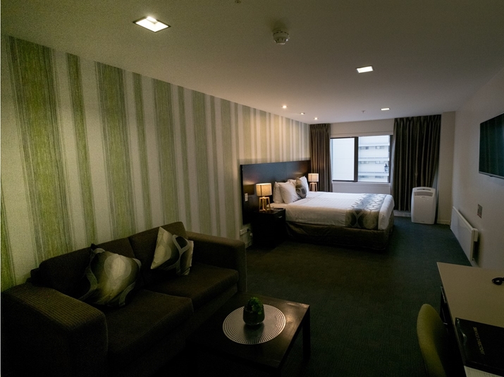 Das Studio (25 qm) verfügt über eine voll ausgestattete Küchenzeile mit einer Mikrowelle, einem Kühlschrank und einem Wasserkocher. Es umfasst auch einen Schreibtisch, einen geräumigen Kleiderschrank und einen Safe im Zimmer. Klimaanlage, ein großes Bad und ein Flachbild-TV mit neuseeländischen Sat-Kanälen stehen zur Verfügung.