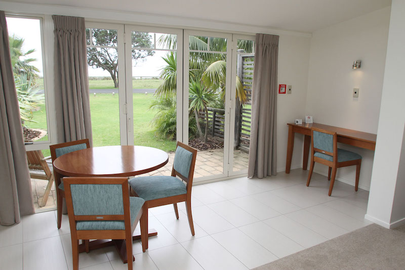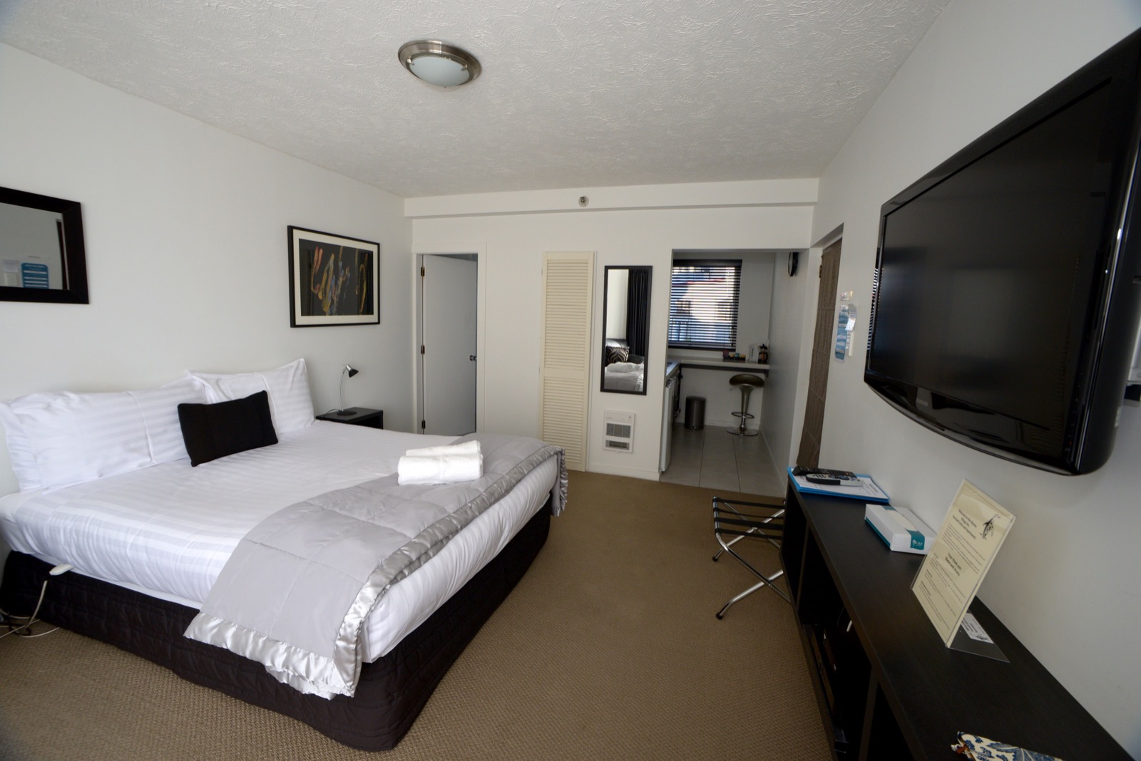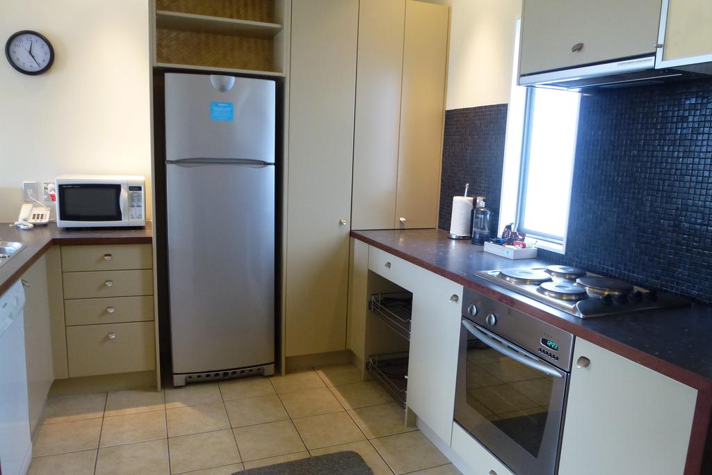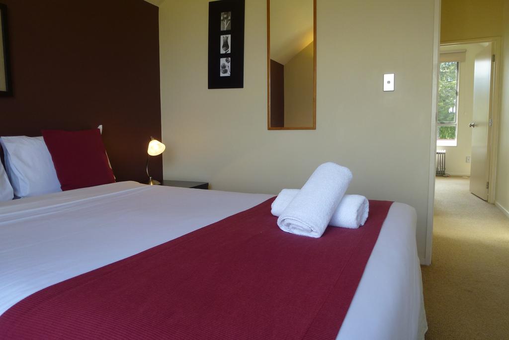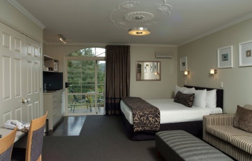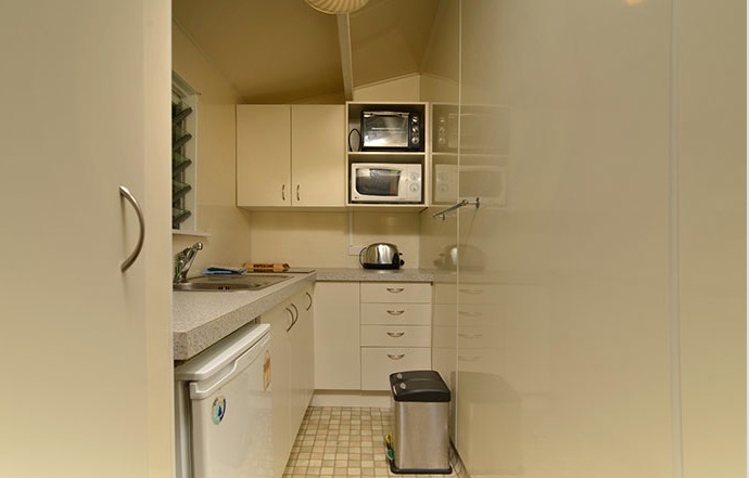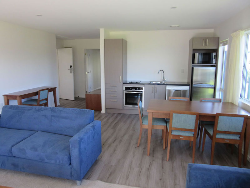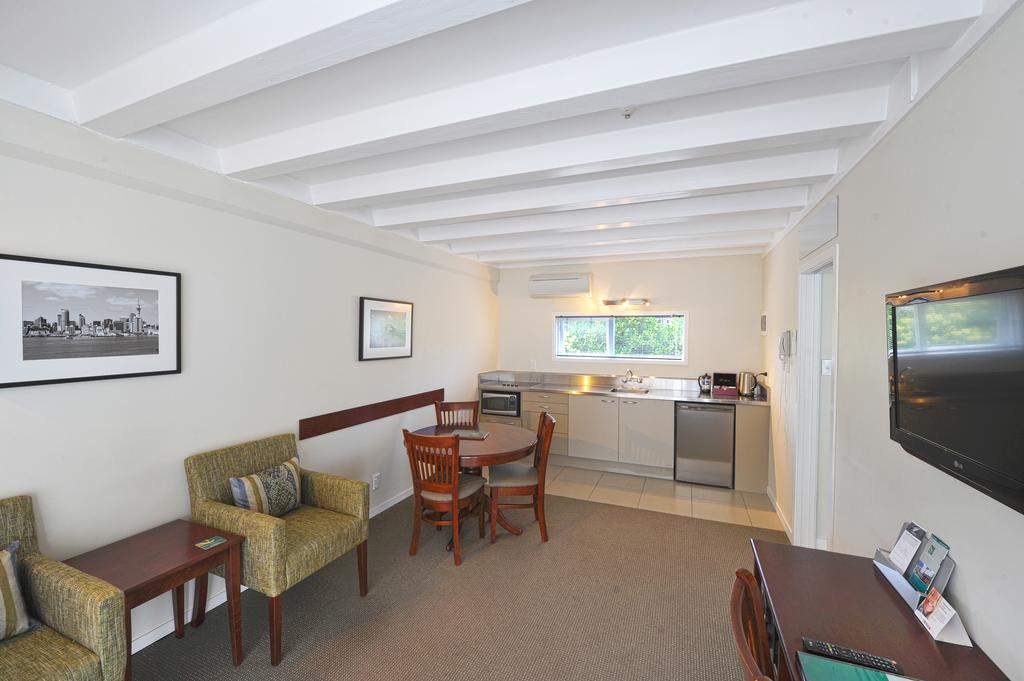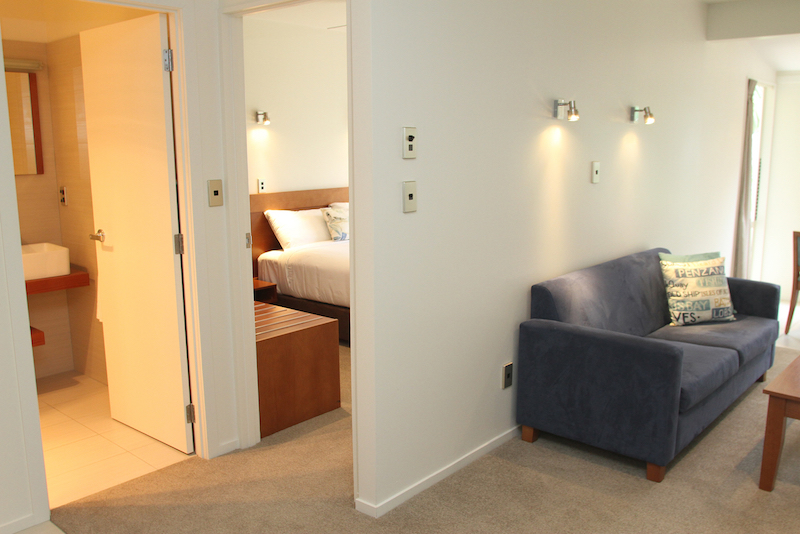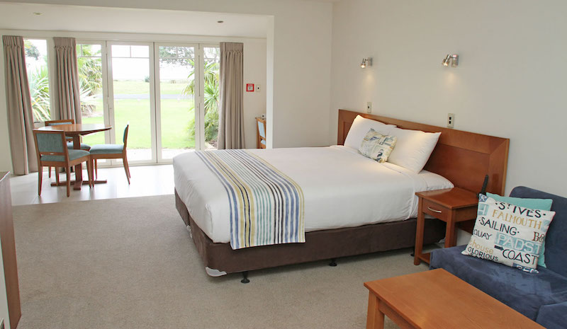 Das Studio (25 qm) verfügt über eine voll ausgestattete Küchenzeile mit einer Mikrowelle, einem Kühlschrank und einem Wasserkocher. Es umfasst auch einen Schreibtisch, einen geräumigen Kleiderschrank und einen Safe im Zimmer. Klimaanlage, ein großes Bad und ein Flachbild-TV mit neuseeländischen Sat-Kanälen stehen zur Verfügung.