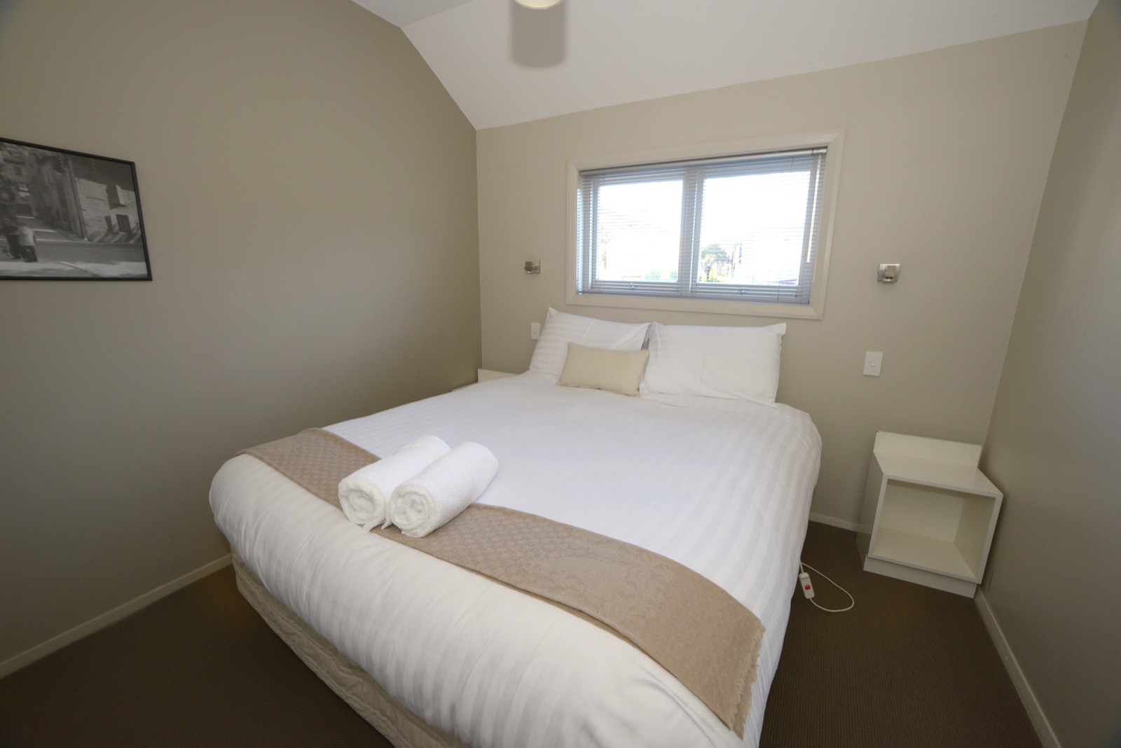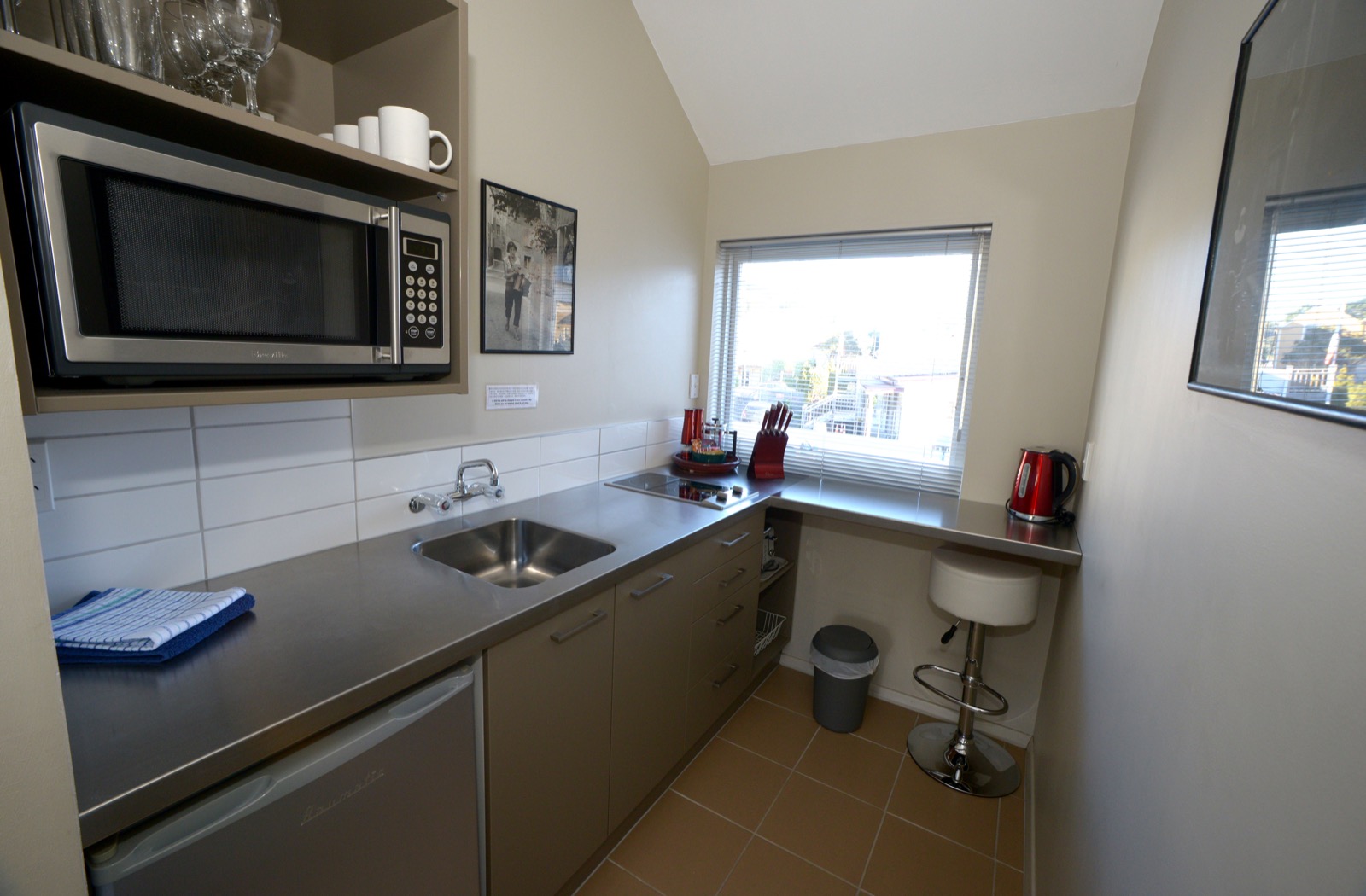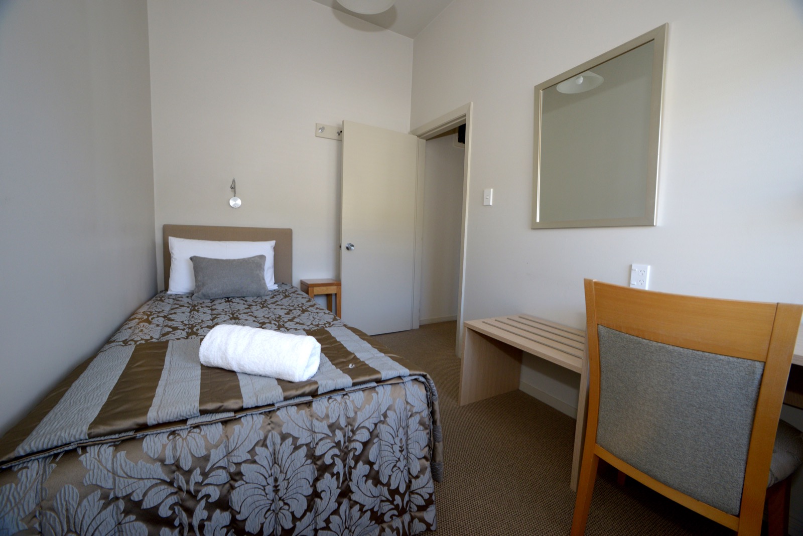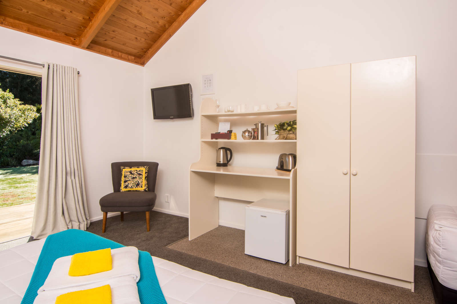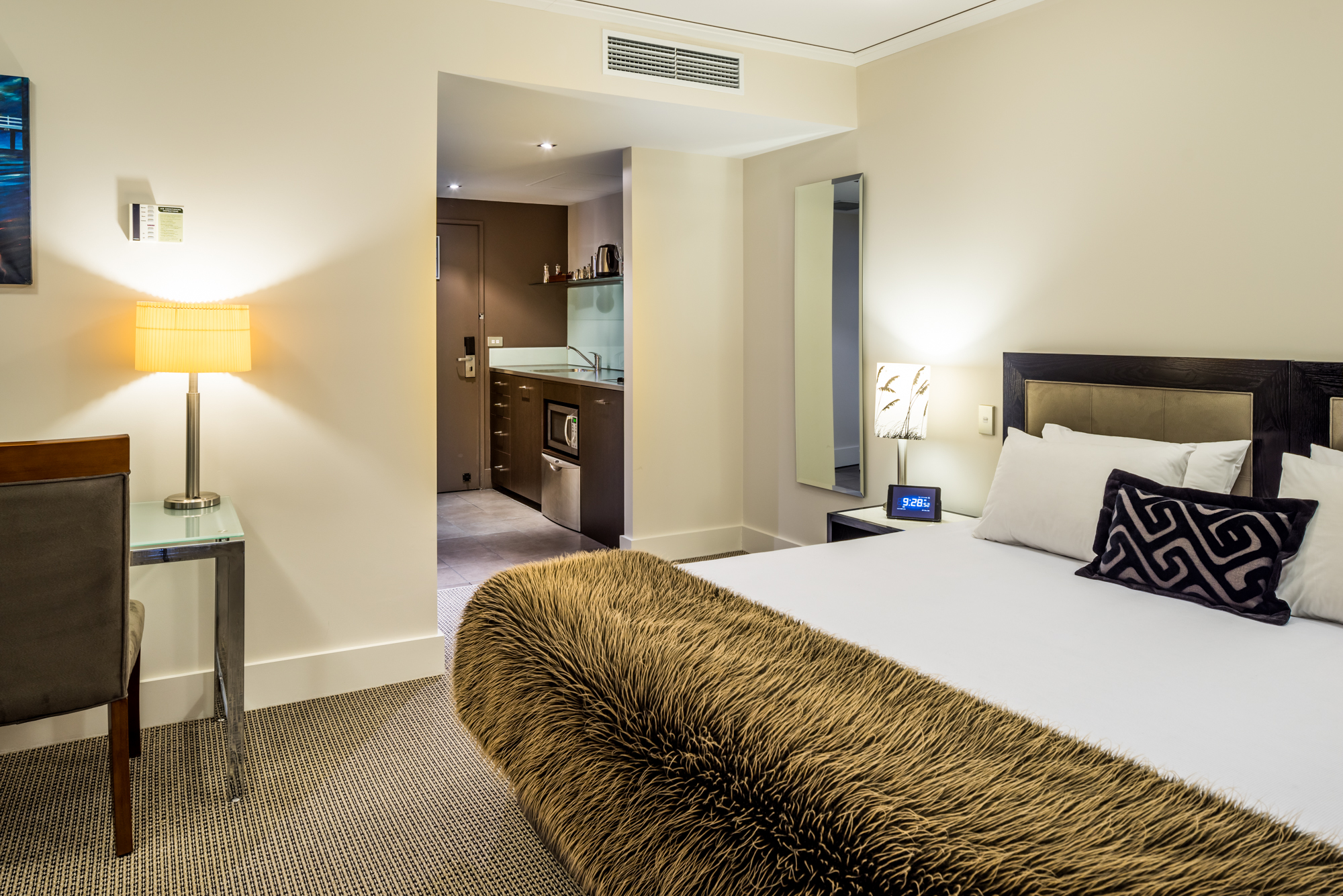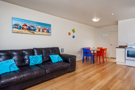Das Studio (25 qm) verfügt über eine voll ausgestattete Küchenzeile mit einer Mikrowelle, einem Kühlschrank und einem Wasserkocher. Es umfasst auch einen Schreibtisch, einen geräumigen Kleiderschrank und einen Safe im Zimmer. Klimaanlage, ein großes Bad und ein Flachbild-TV mit neuseeländischen Sat-Kanälen stehen zur Verfügung.