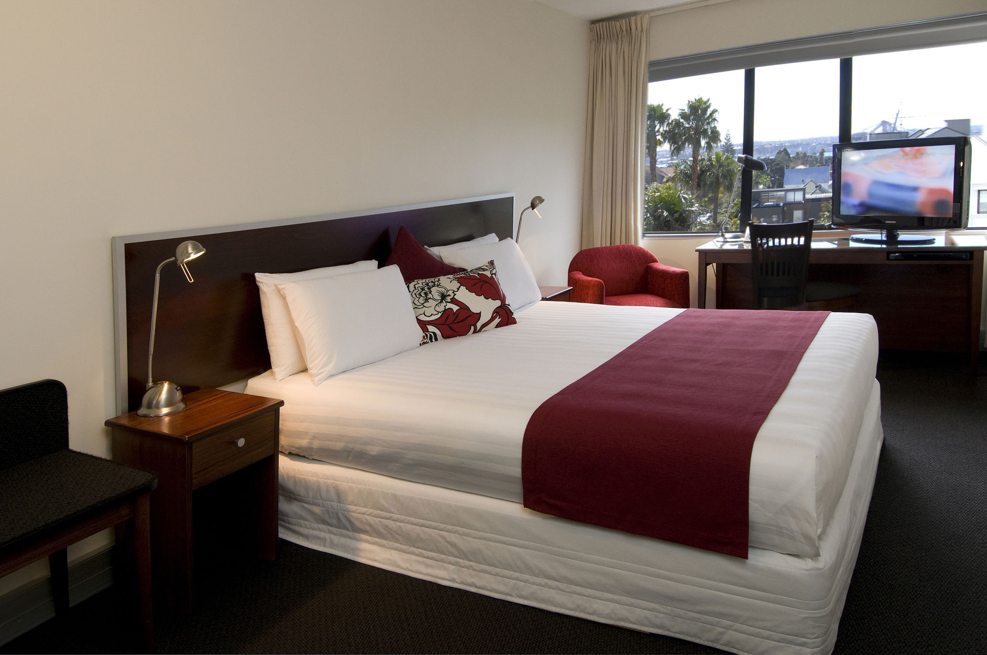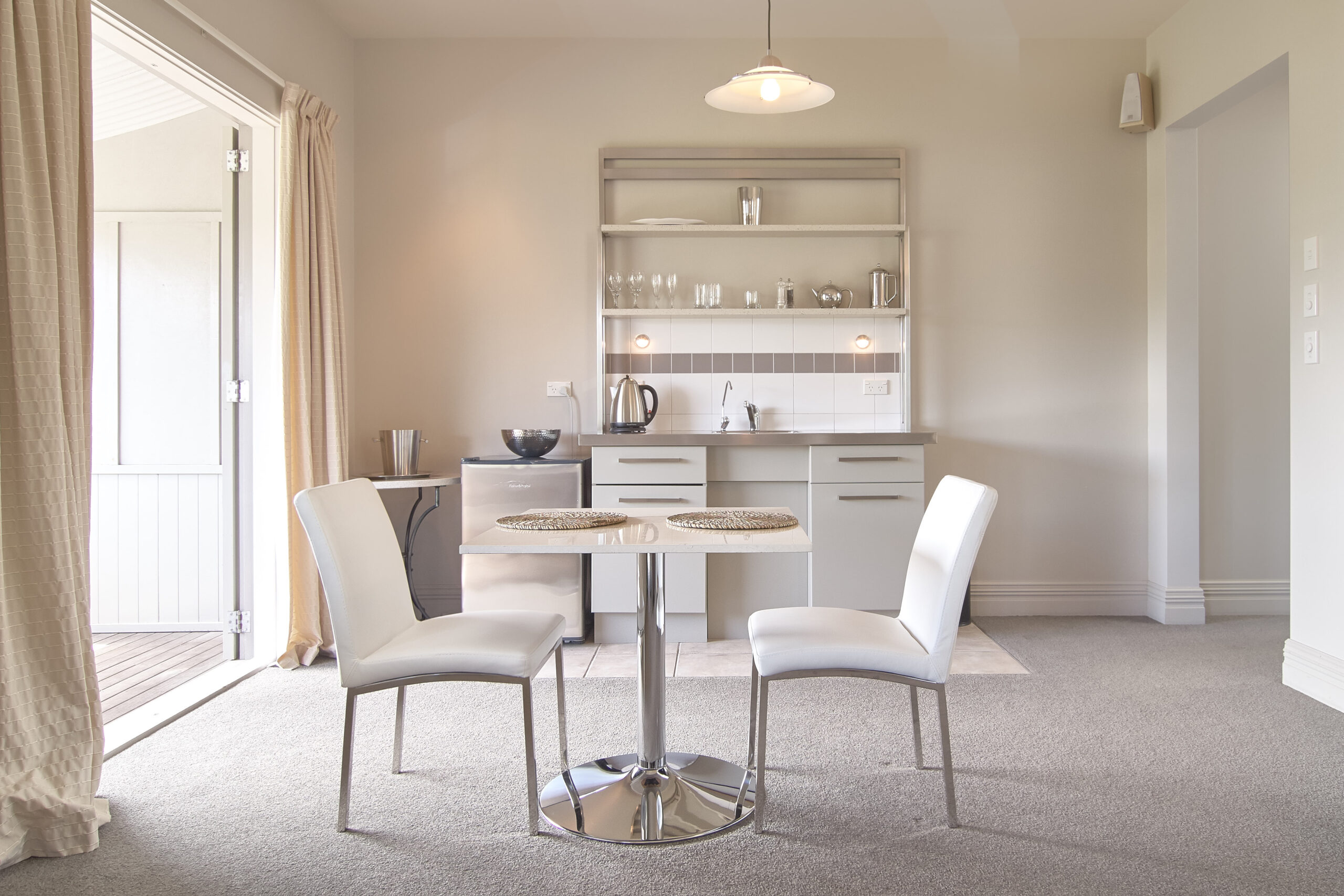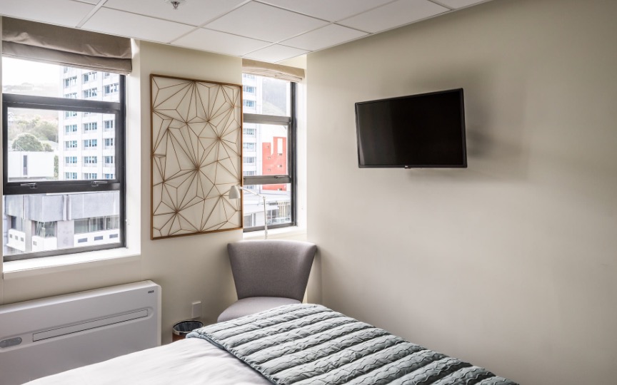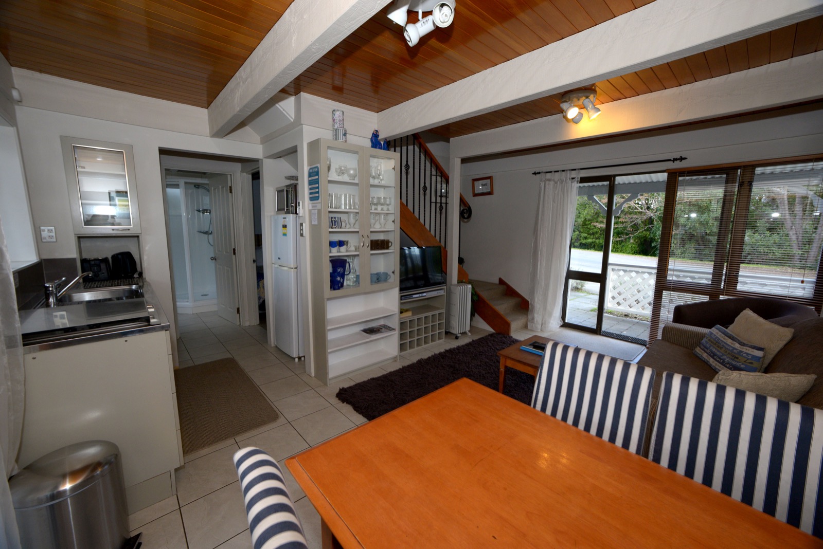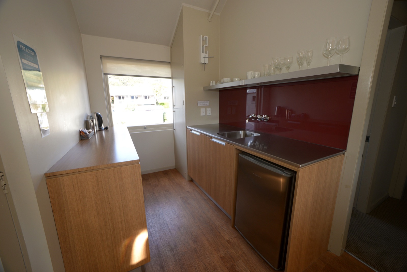 Das Studio (25 qm) verfügt über eine voll ausgestattete Küchenzeile mit einer Mikrowelle, einem Kühlschrank und einem Wasserkocher. Es umfasst auch einen Schreibtisch, einen geräumigen Kleiderschrank und einen Safe im Zimmer. Klimaanlage, ein großes Bad und ein Flachbild-TV mit neuseeländischen Sat-Kanälen stehen zur Verfügung.