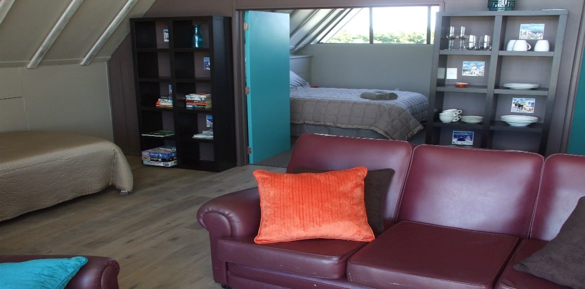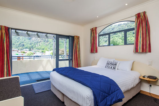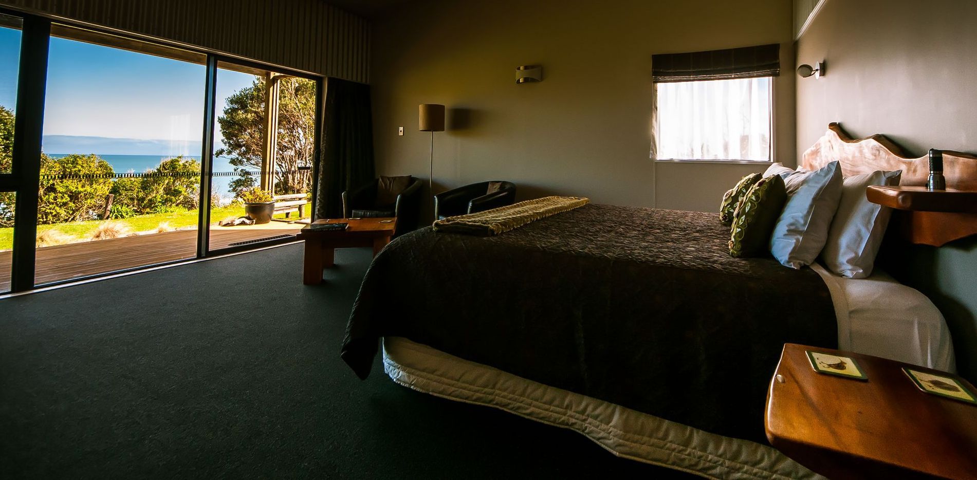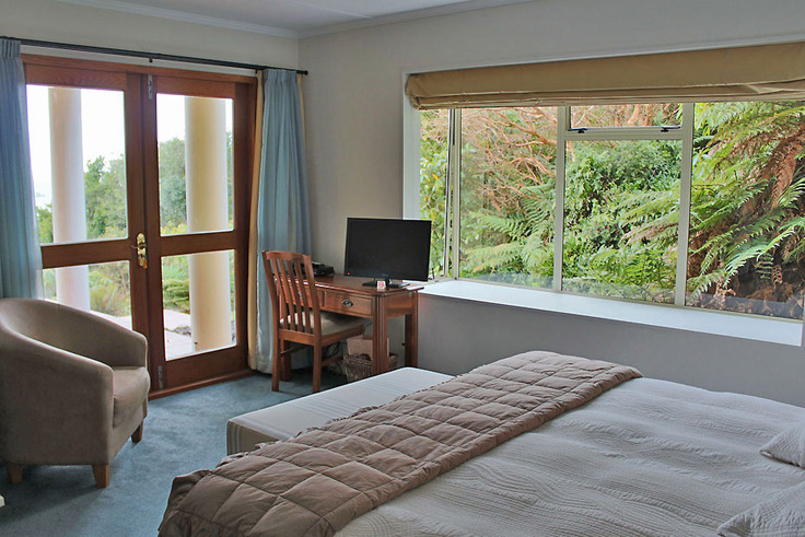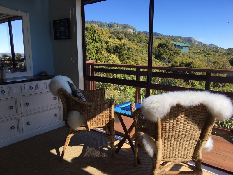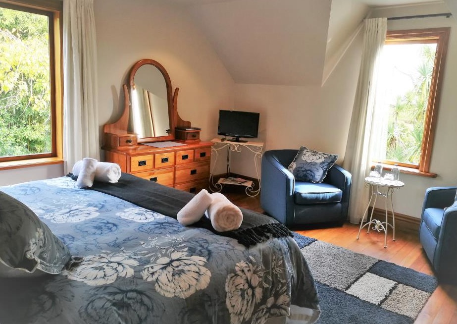 Das Zimmer liegt in der oberen Etage mit Blick aufs Meer und den Pancake Rock. Es verfügt über ein Queensize-Bett, ein eigenes Bad und einen eigenen Wintergarten.