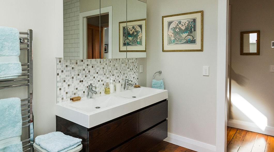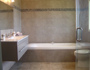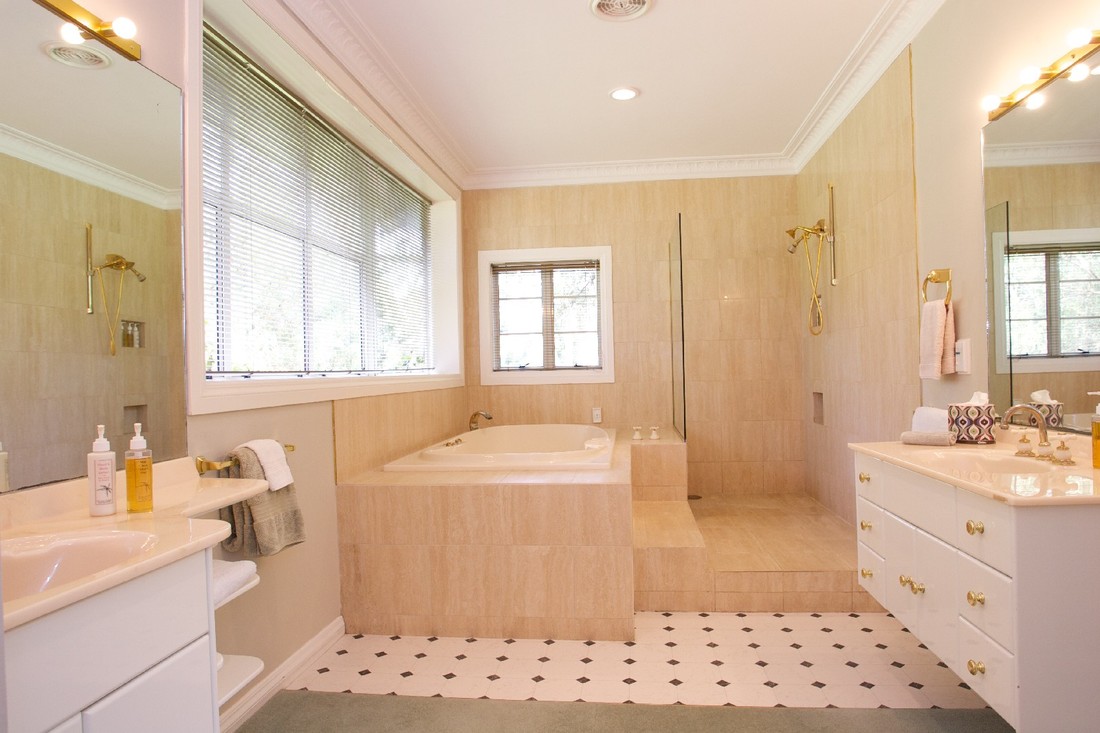 - Bad mit Dusche, zwei Waschtischen und Fußbodenheizung