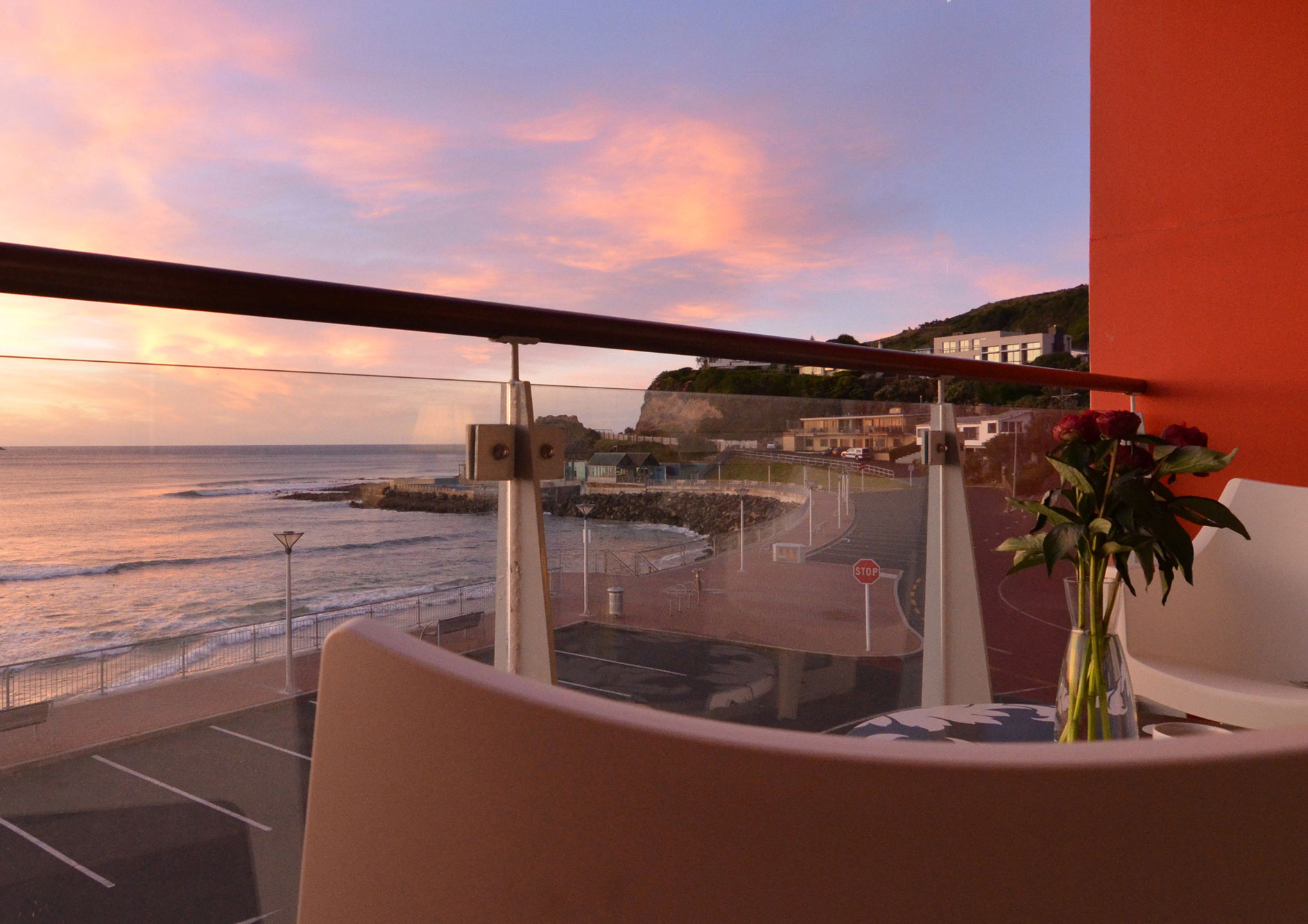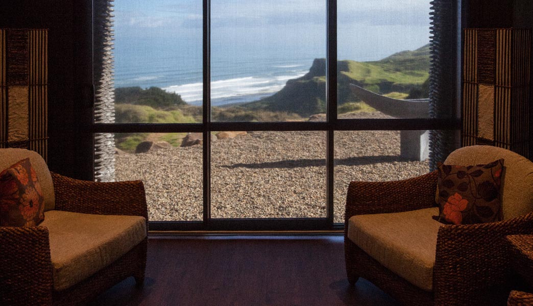Das Zimmer liegt auf der oberen Etage mit Blick auf das Meer und den Pancake Rock. Es verfügt über ein Queensize-Bett, ein eigenes Bad und öffnet sich hin zu einem eigenen großen Wintergarten.