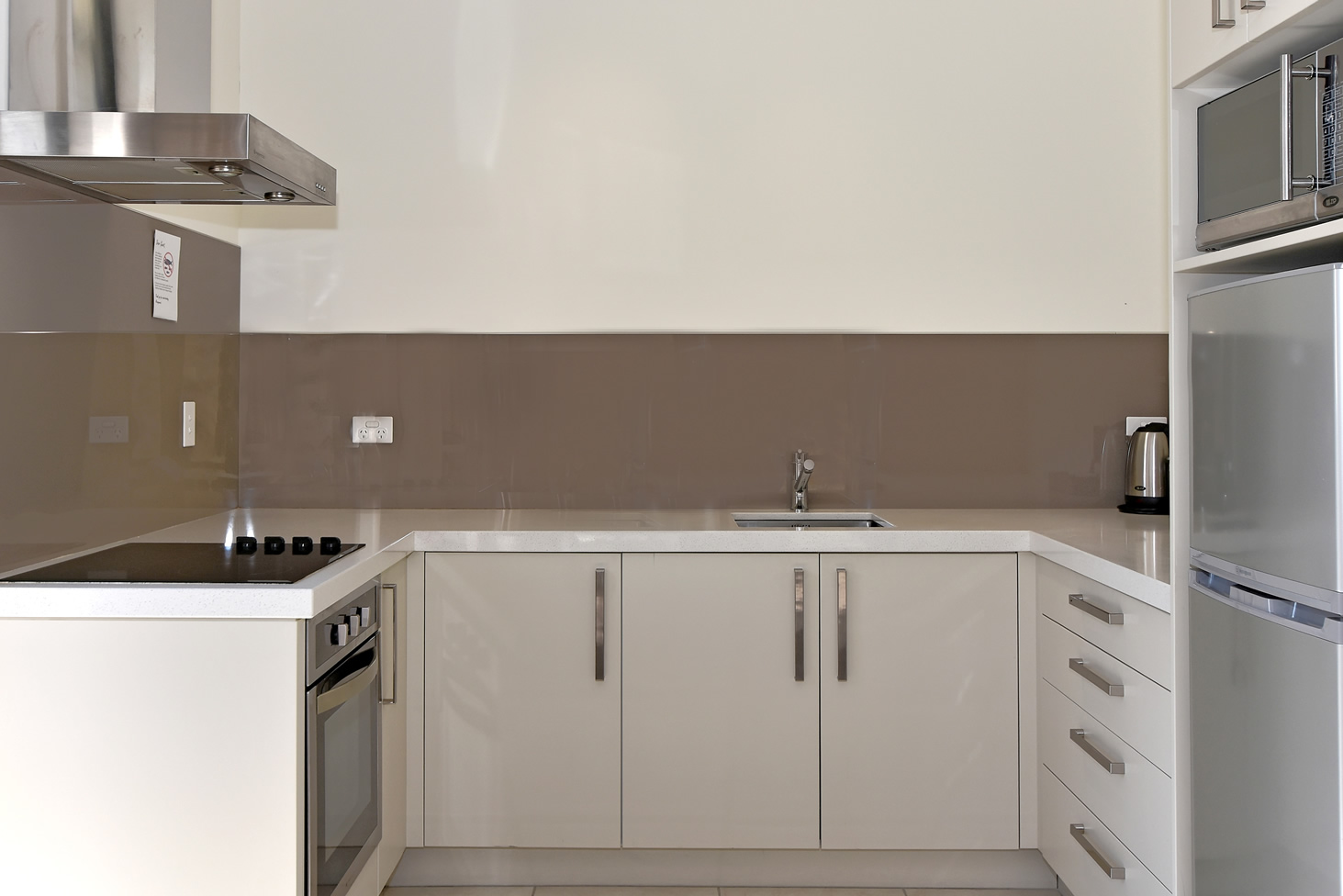- Küchennische mit Mikrowelle, Kühlschrank, Wasserkocher, Teller und Besteck