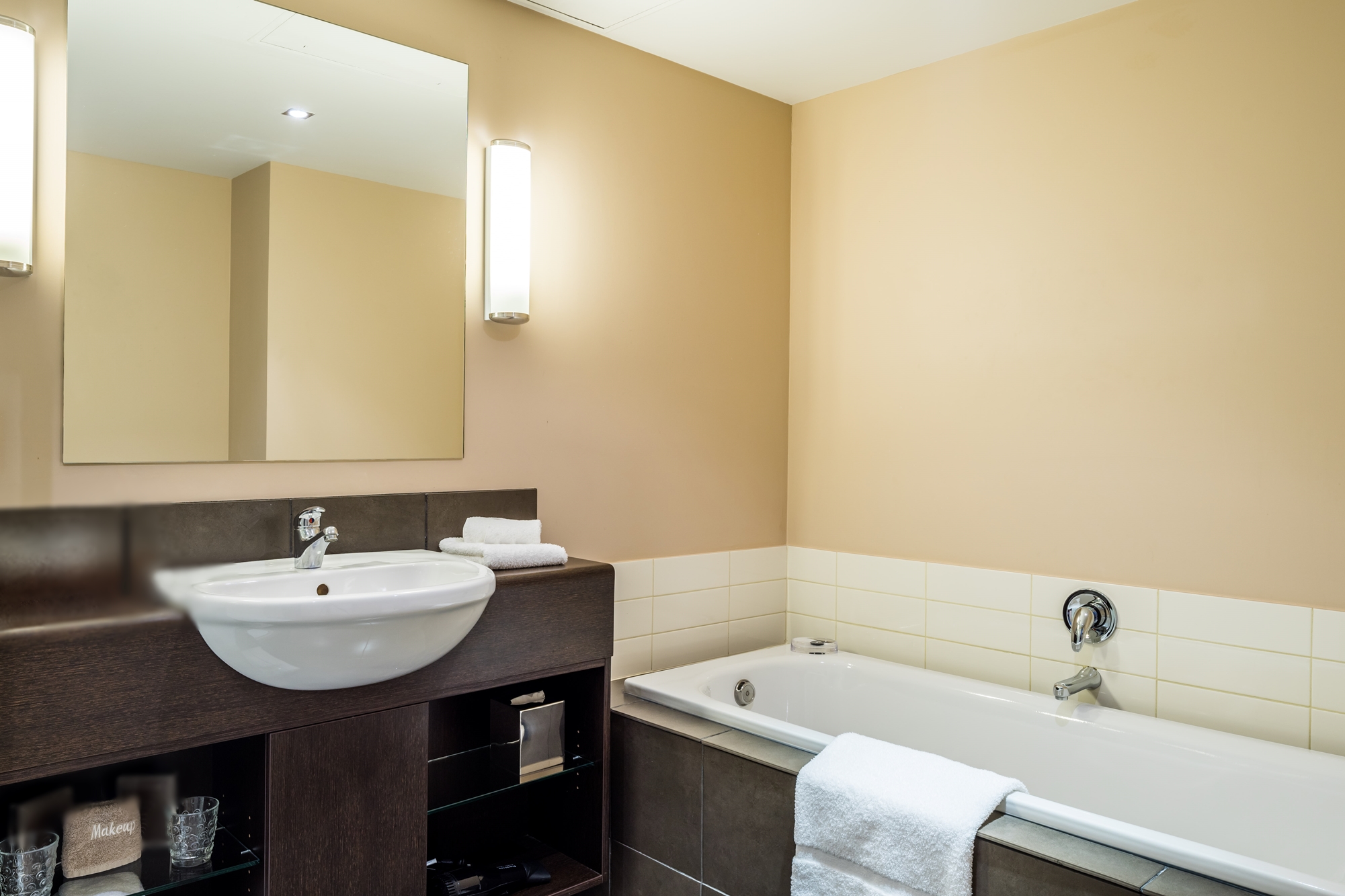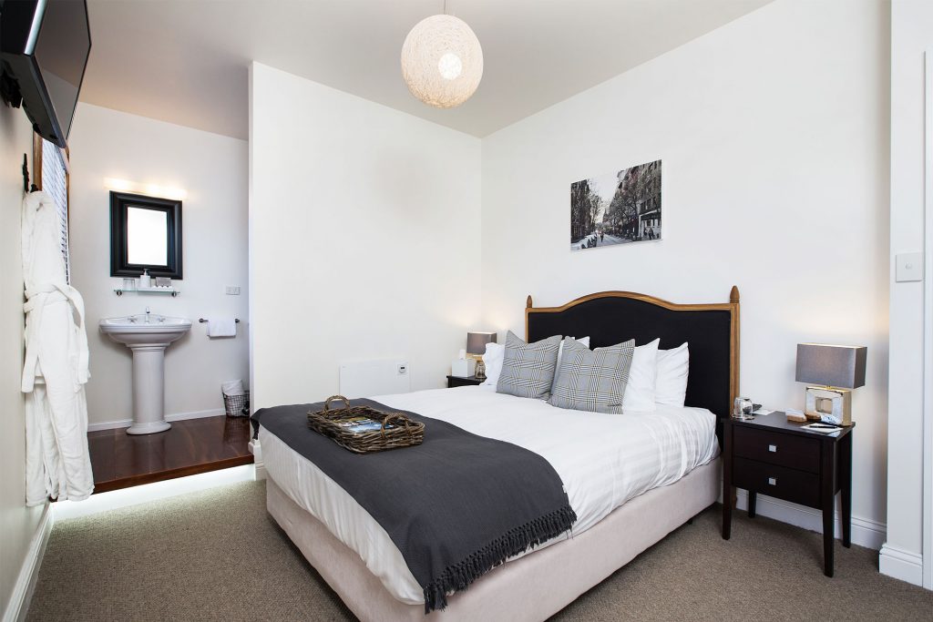 Ein geräumiges Studio-Zimmer mit einem Kingsize-Bett und einer Küchenzeile. Das Ensuite-Badezimmer hat den zusätzlichen Luxus einer großen Doppel-Whirlpool-Badewanne.