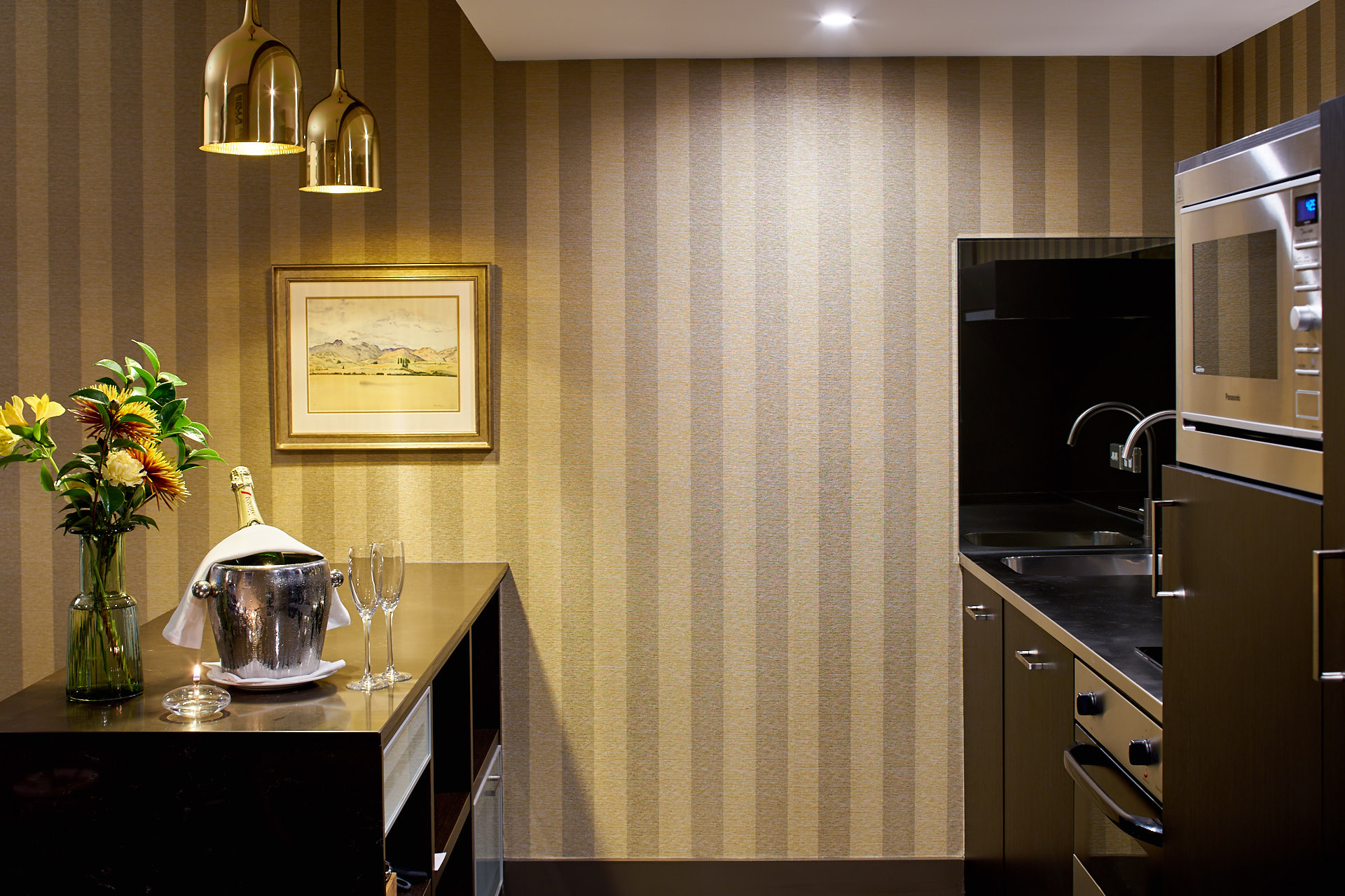 Dieses Studio (35 qm) verfügt über eine komplett ausgestattete Küche mit einem Backofen, einem Kühlschrank, einem Gefrierschrank, einer Mikrowelle und Küchenutensilien. Zur weiteren Ausstattung gehören ein Schreibtisch, ein eigener Safe sowie eine großer Kleiderschrank. Eine Minibar, Tee- und Kaffeezubehör, Klimaanlage und ein Bügeleisen/-brett sind ebenfalls vorhanden.