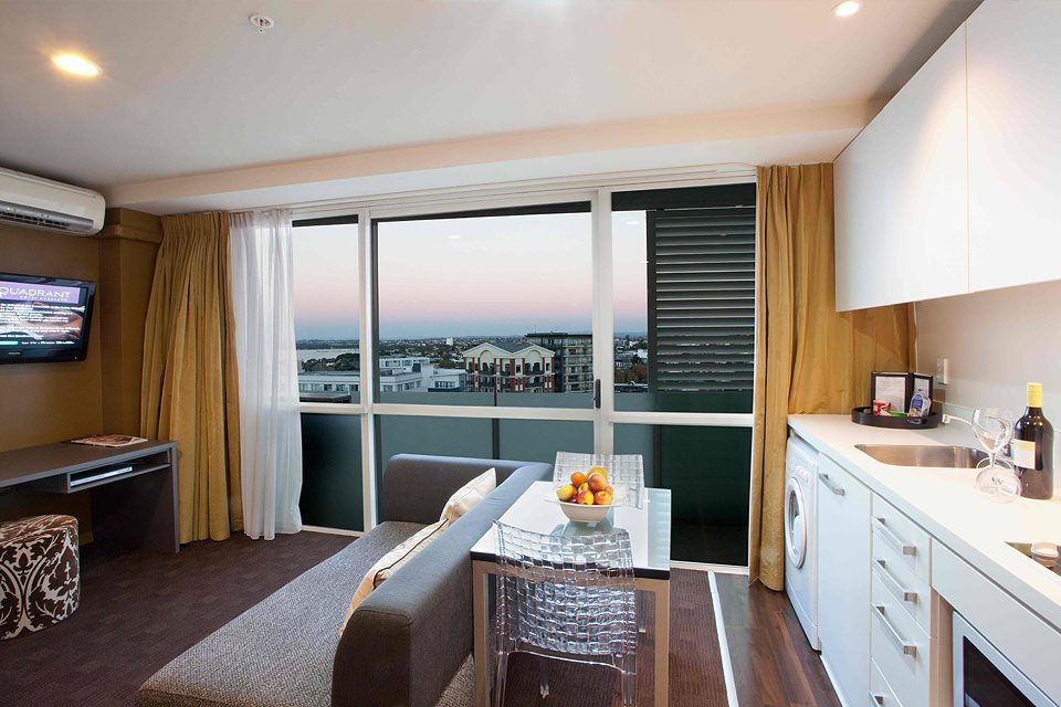 Das The Quadrant Hotel & Suites mit Blick auf den Hafen Waitemata und den Albert Park bietet unterschiedliche Zimmer & Apartments zur Selbstverpflegung mit einem eigenen Balkon und kostenfreiem WLAN. Es verfügt über eine Bar, einen Whirlpool und ein Fitnesscenter. Die Geschäfte, Restaurants und Cafés in der Queen Street sind weniger als 10 Gehminuten entfernt. Alle Apartments verfügen über einen Sitzbereich mit einem Flachbild-Sat-TV und einem CD- / DVD-Player. Einige Zimmer bieten zudem einen schönen Blick auf den Hafen oder die Stadt. Das Quad Kitchen Café serviert eine Auswahl an Salaten, Burgern und Steaks. Die Quad Bar bietet eine Auswahl an Snacks, klassischen Cocktails und neuseeländischen Weinen