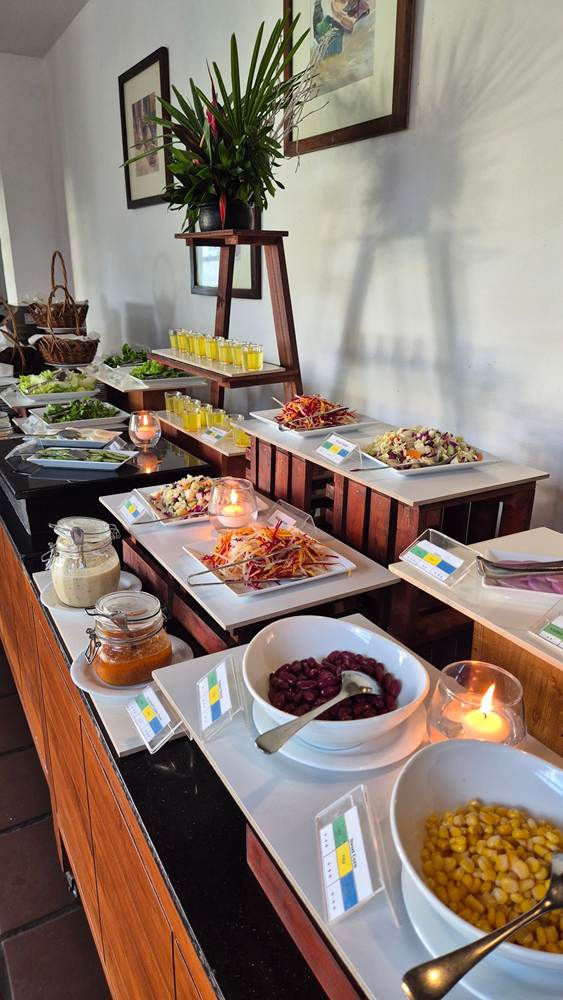 Jeden Tag wartete ein ayurvedisches Frühstücksbuffet auf mich, das ebenso wie das Mittag- und Abendessen mit liebevoll zubereiteten typgerechten Speisen begeisterte. Jedes Gericht war mit Hinweisen zu den Doshas versehen, sodass ich ganz bewusst wählen konnte, was mir guttat. Und ja: Auch bei einer Ayurveda-Kur darf genussvoll gegessen werden! Ich habe selten so bunt, frisch und vielfältig gespeist wie hier! Salate, Suppen, leckere Currys, Obst, Desserts und mehr- hungern muss bei einer Kur niemand.