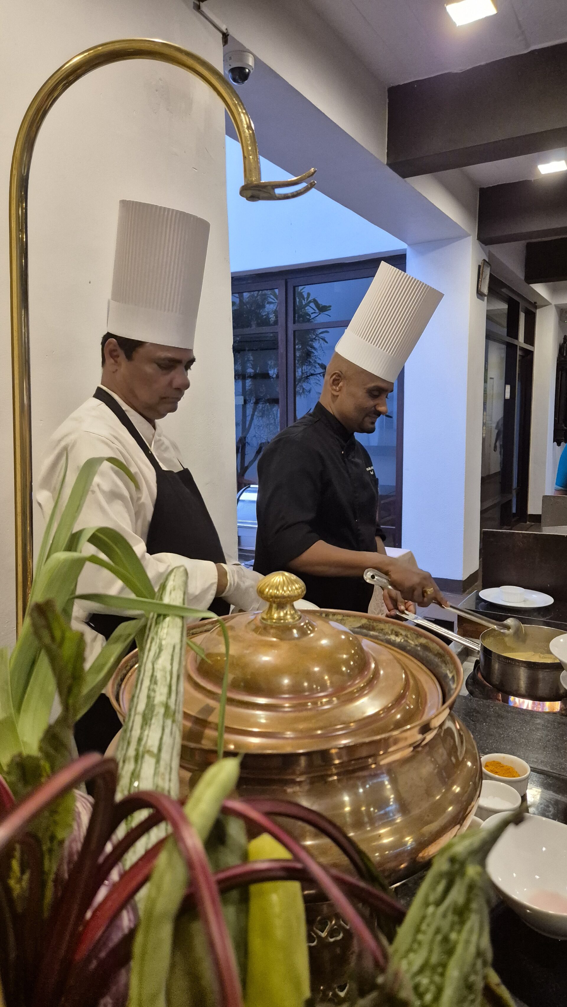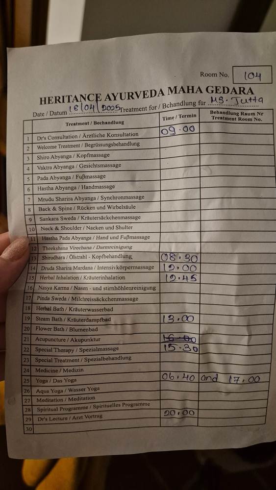Die Behandlungen waren von einer Tiefe und Qualität, wie ich es selten erlebt habe. Ich genoss bis zu sechs Anwendungen pro Tag, darunter Synchronmassagen, Kräuterdampfbäder, Blumenbäder, Kräuterstempelmassagen, Shirodhara (der berühmte Stirnguss mit warmem Öl) und Nasya (Behandlungen zur Reinigung der Nebenhöhlen). Besonders der Shirodhara hat mich tief berührt – mein ganzes Nervensystem durfte sich dabei neu ordnen und ganz zur Ruhe kommen.