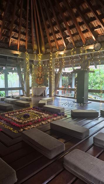 Der Tag begann früh mit sanftem Yoga um 6:40 Uhr im Garten, direkt mit Blick aufs Meer. Am späten Nachmittag folgte eine zweite Einheit um 17 Uhr, die den Tag ruhig ausklingen ließ. Dazwischen gab es stille Momente, Meditationen, manchmal auch Zeremonien oder eine Begegnung mit einem Mönch. Alles durfte sein – nichts musste. Ein Tagesrhythmus, der nicht fordert, sondern die Gäste trägt und vor allem auch die geistige Reinigung gut unterstützt.