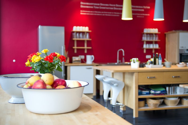 Filterkaffee, Leitungswasser, heißes Ingwerwasser und Kräutertee stehen dir jederzeit zur Verfügung. Auch Nüsse, Obst und Kekse stehen für dich bereit.