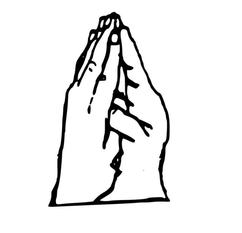 - Die Handrücken und die Finger berühren sich. Die Daumen sind abgespreizt.